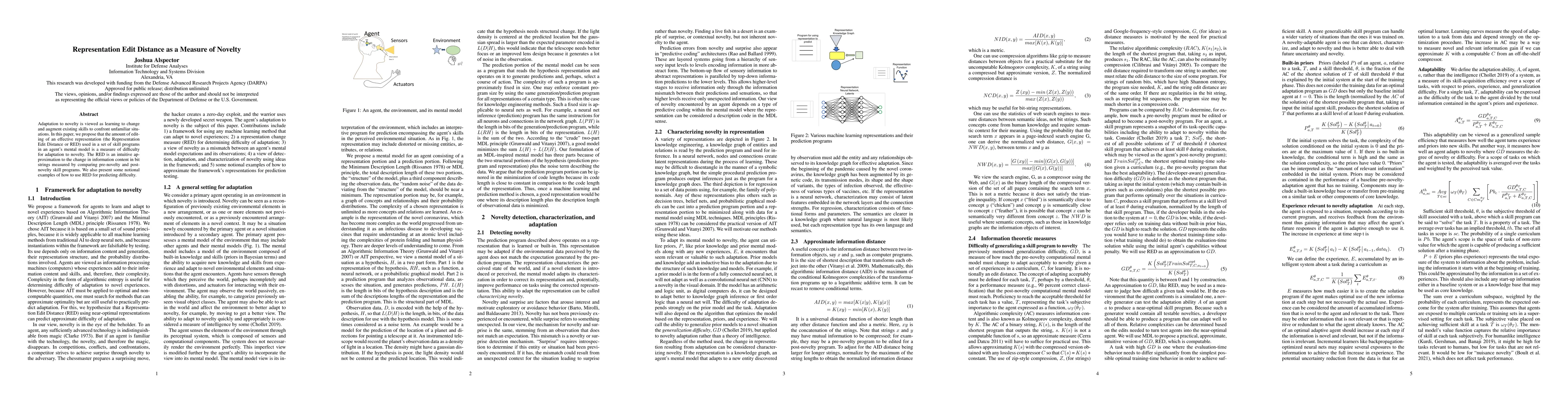 Adaptation to novelty is viewed as learning to change and augment existing skills to confront unfamiliar situations. In this paper, we propose that the amount of editing of an effective representation (the Representation Edit Distance or RED) used in a set of skill programs in an agent's mental model is a measure of difficulty for adaptation to novelty. The RED is an intuitive approximation to the change in information content in bit strings measured by comparing pre-novelty and post-novelty skill programs. We also present some notional examples of how to use RED for predicting difficulty.