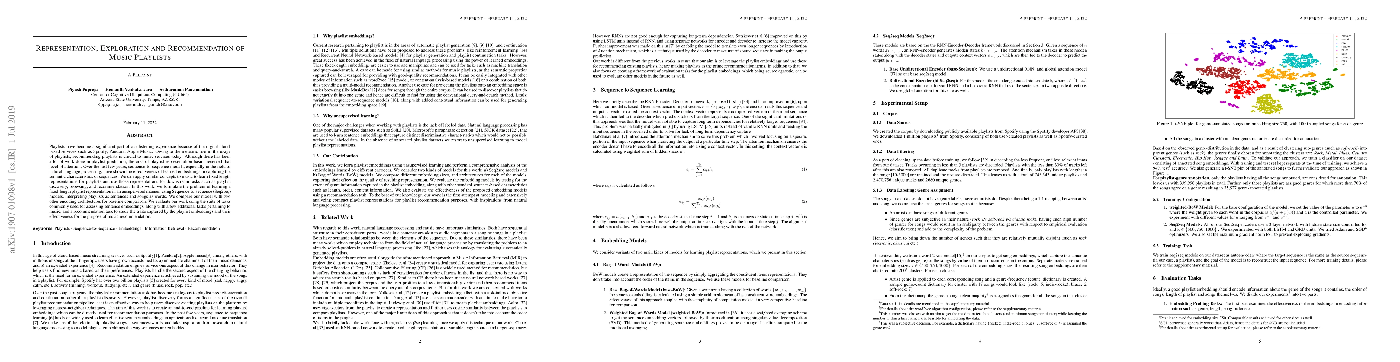 Playlists have become a significant part of our listening experience because of the digital cloud-based services such as Spotify, Pandora, Apple Music. Owing to the meteoric rise in the usage of playlists, recommending playlists is crucial to music services today. Although there has been a lot of work done in playlist prediction, the area of playlist representation hasn't received that level of attention. Over the last few years, sequence-to-sequence models, especially in the field of natural language processing, have shown the effectiveness of learned embeddings in capturing the semantic characteristics of sequences. We can apply similar concepts to music to learn fixed length representations for playlists and use those representations for downstream tasks such as playlist discovery, browsing, and recommendation. In this work, we formulate the problem of learning a fixed-length playlist representation in an unsupervised manner, using Sequence-to-sequence (Seq2seq) models, interpreting playlists as sentences and songs as words. We compare our model with two other encoding architectures for baseline comparison. We evaluate our work using the suite of tasks commonly used for assessing sentence embeddings, along with a few additional tasks pertaining to music, and a recommendation task to study the traits captured by the playlist embeddings and their effectiveness for the purpose of music recommendation.