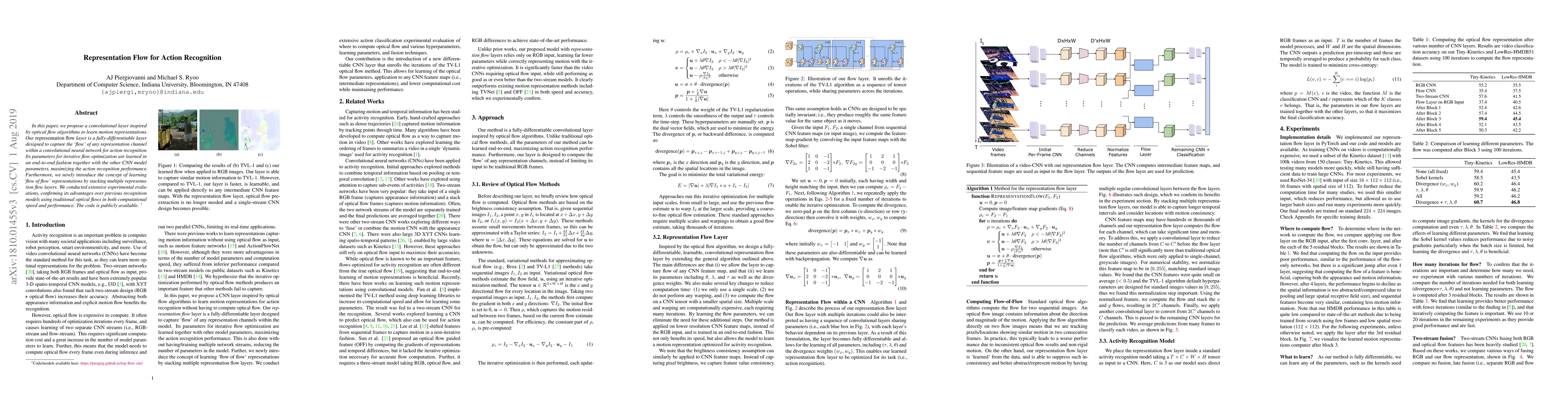 In this paper, we propose a convolutional layer inspired by optical flow algorithms to learn motion representations. Our representation flow layer is a fully-differentiable layer designed to capture the `flow' of any representation channel within a convolutional neural network for action recognition. Its parameters for iterative flow optimization are learned in an end-to-end fashion together with the other CNN model parameters, maximizing the action recognition performance. Furthermore, we newly introduce the concept of learning `flow of flow' representations by stacking multiple representation flow layers. We conducted extensive experimental evaluations, confirming its advantages over previous recognition models using traditional optical flows in both computational speed and performance. Code/models available here: https://piergiaj.github.io/rep-flow-site/