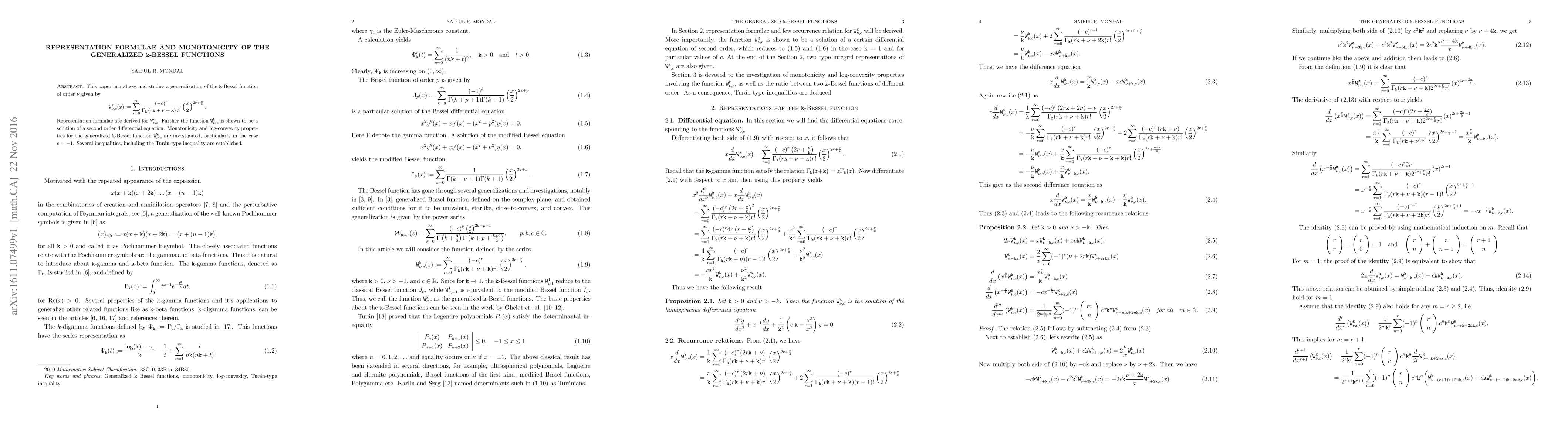 This paper introduces and studies a generalization of the $\mathtt{k}$-Bessel function of order $\nu$ given by \[\mathtt{W}^{\mathtt{k}}_{\nu, c}(x):= \sum_{r=0}^\infty \frac{(-c)^r}{\Gamma_{\mathtt{k}}\left( r \mathtt{k} +\nu+\mathtt{k}\right) r!} \left(\frac{x}{2}\right)^{2r+\frac{\nu}{\mathtt{k}}}. \] Representation formulae are derived for $\mathtt{W}^{\mathtt{k}}_{\nu, c}.$ Further the function $\mathtt{W}^{\mathtt{k}}_{\nu, c}$ is shown to be a solution of a second order differential equation. Monotonicity and log-convexity properties for the generalized $\mathtt{k}$-Bessel function $\mathtt{W}^{\mathtt{k}}_{\nu, c}$ are investigated, particularly in the case $c=-1$. Several inequalities, including the Tur\'an-type inequality are established.