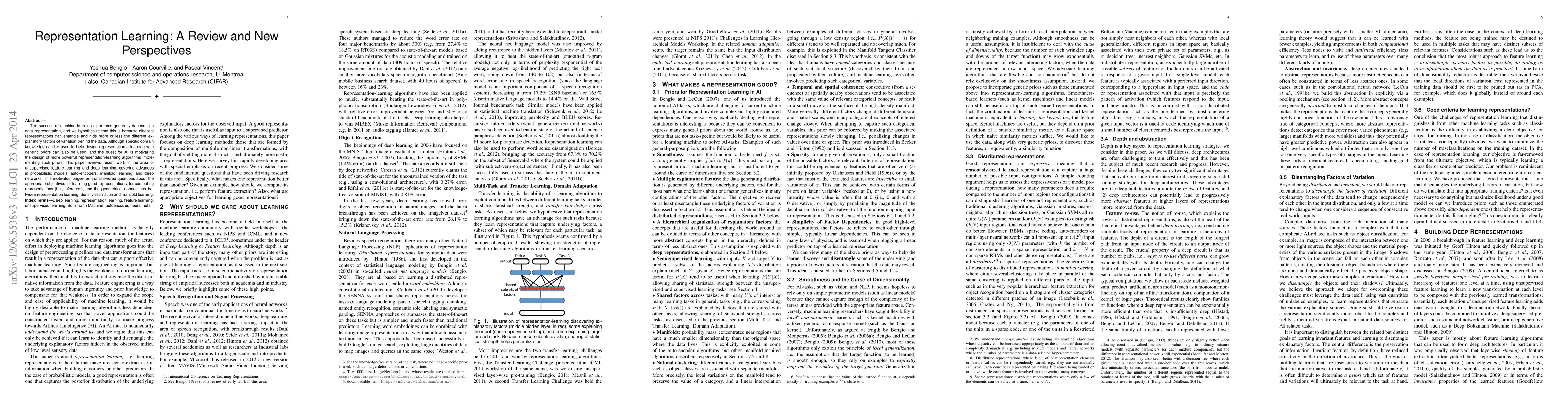 The success of machine learning algorithms generally depends on data representation, and we hypothesize that this is because different representations can entangle and hide more or less the different explanatory factors of variation behind the data. Although specific domain knowledge can be used to help design representations, learning with generic priors can also be used, and the quest for AI is motivating the design of more powerful representation-learning algorithms implementing such priors. This paper reviews recent work in the area of unsupervised feature learning and deep learning, covering advances in probabilistic models, auto-encoders, manifold learning, and deep networks. This motivates longer-term unanswered questions about the appropriate objectives for learning good representations, for computing representations (i.e., inference), and the geometrical connections between representation learning, density estimation and manifold learning.
