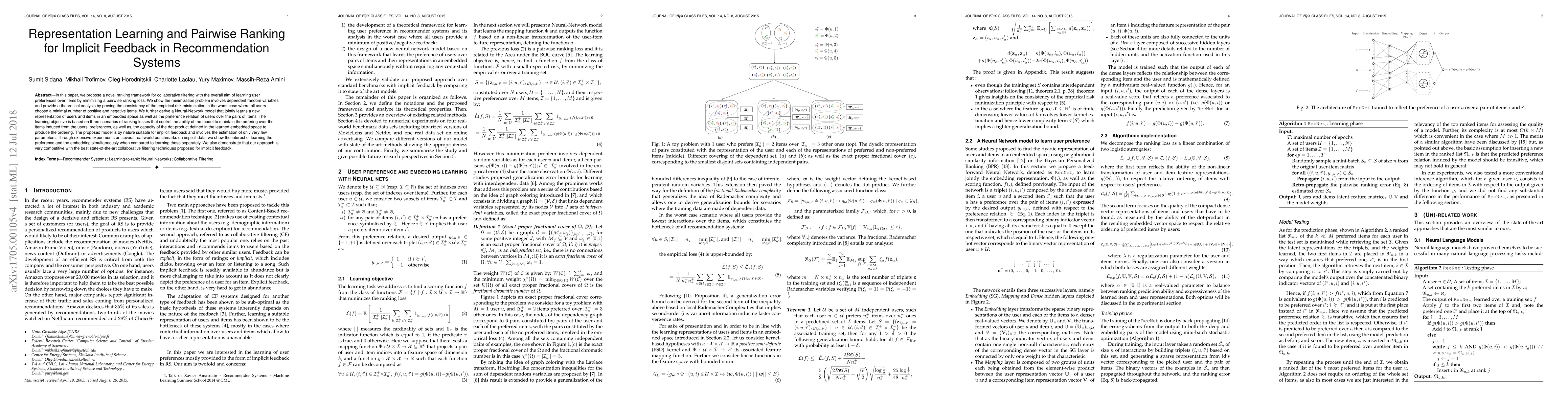 In this paper, we propose a novel ranking framework for collaborative filtering with the overall aim of learning user preferences over items by minimizing a pairwise ranking loss. We show the minimization problem involves dependent random variables and provide a theoretical analysis by proving the consistency of the empirical risk minimization in the worst case where all users choose a minimal number of positive and negative items. We further derive a Neural-Network model that jointly learns a new representation of users and items in an embedded space as well as the preference relation of users over the pairs of items. The learning objective is based on three scenarios of ranking losses that control the ability of the model to maintain the ordering over the items induced from the users' preferences, as well as, the capacity of the dot-product defined in the learned embedded space to produce the ordering. The proposed model is by nature suitable for implicit feedback and involves the estimation of only very few parameters. Through extensive experiments on several real-world benchmarks on implicit data, we show the interest of learning the preference and the embedding simultaneously when compared to learning those separately. We also demonstrate that our approach is very competitive with the best state-of-the-art collaborative filtering techniques proposed for implicit feedback.