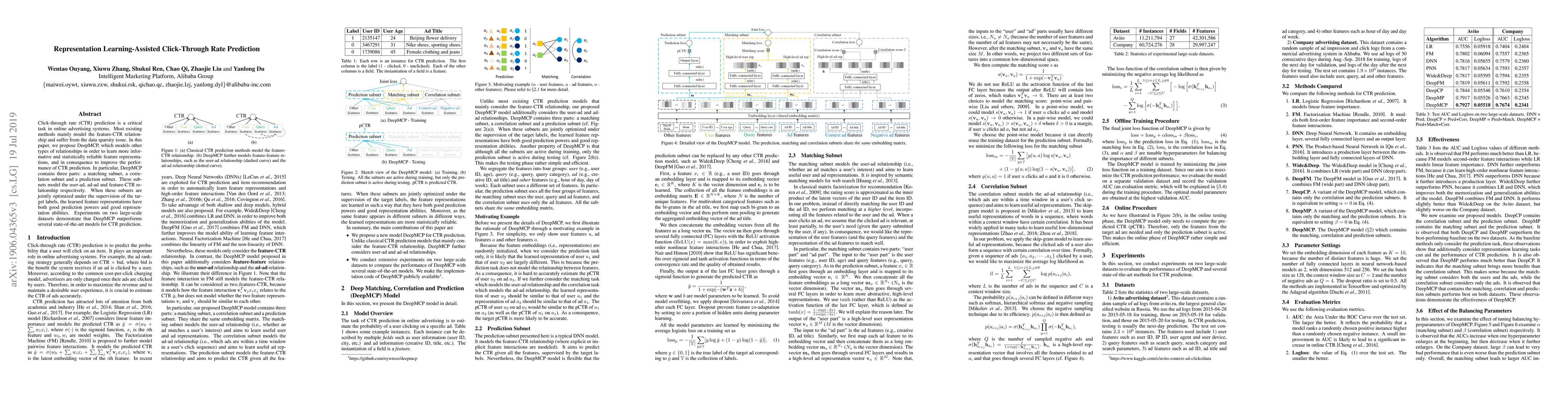 This paper introduces DeepMCP, a novel framework for improving click-through rate prediction by modeling user-ad, ad-ad, and feature-CTR relationships through matching, correlation, and prediction subnets. Experiments show that DeepMCP outperforms existing state-of-the-art models on large-scale datasets.