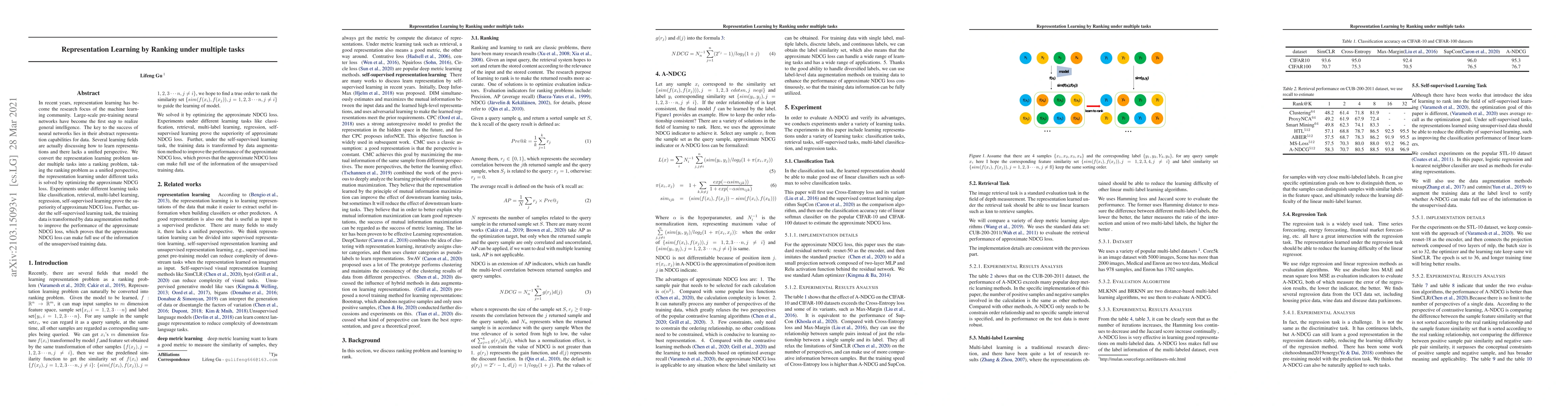 In recent years, representation learning has become the research focus of the machine learning community. Large-scale pre-training neural networks have become the first step to realize general intelligence. The key to the success of neural networks lies in their abstract representation capabilities for data. Several learning fields are actually discussing how to learn representations and there lacks a unified perspective. We convert the representation learning problem under multiple tasks into a ranking problem, taking the ranking problem as a unified perspective, the representation learning under different tasks is solved by optimizing the approximate NDCG loss. Experiments under different learning tasks like classification, retrieval, multi-label learning, regression, self-supervised learning prove the superiority of approximate NDCG loss. Further, under the self-supervised learning task, the training data is transformed by data augmentation method to improve the performance of the approximate NDCG loss, which proves that the approximate NDCG loss can make full use of the information of the unsupervised training data.