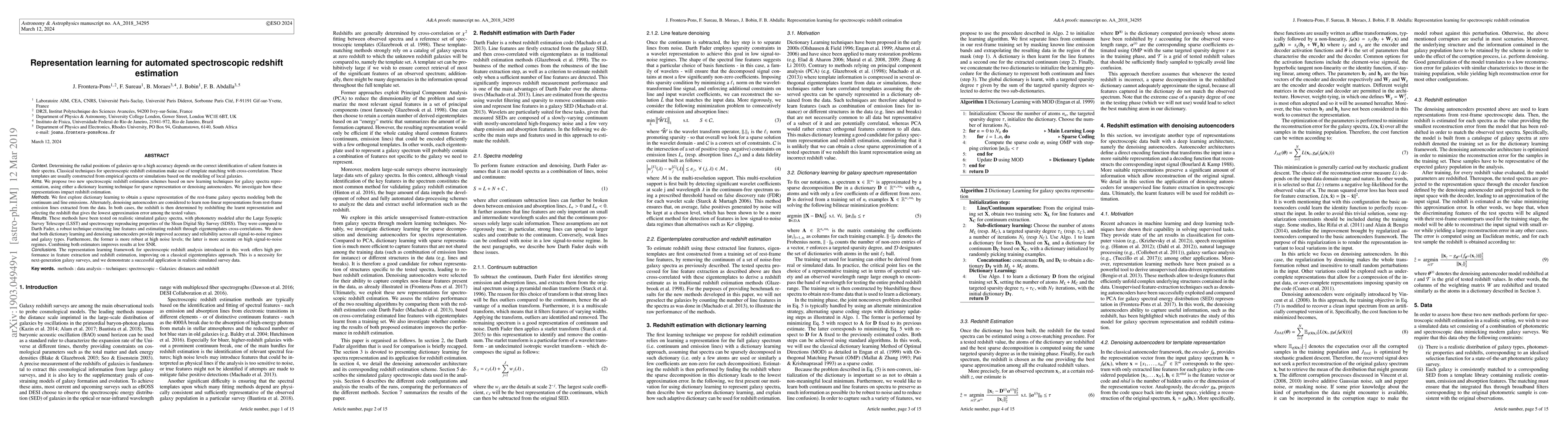 This paper proposes new representation learning techniques for spectroscopic redshift estimation, using dictionary learning and denoising autoencoders, which outperform traditional eigentemplate methods in accuracy and reliability across various galaxy types and signal-to-noise conditions. The methods were tested on simulated galaxy spectra and showed promising results for future large-scale galaxy surveys.