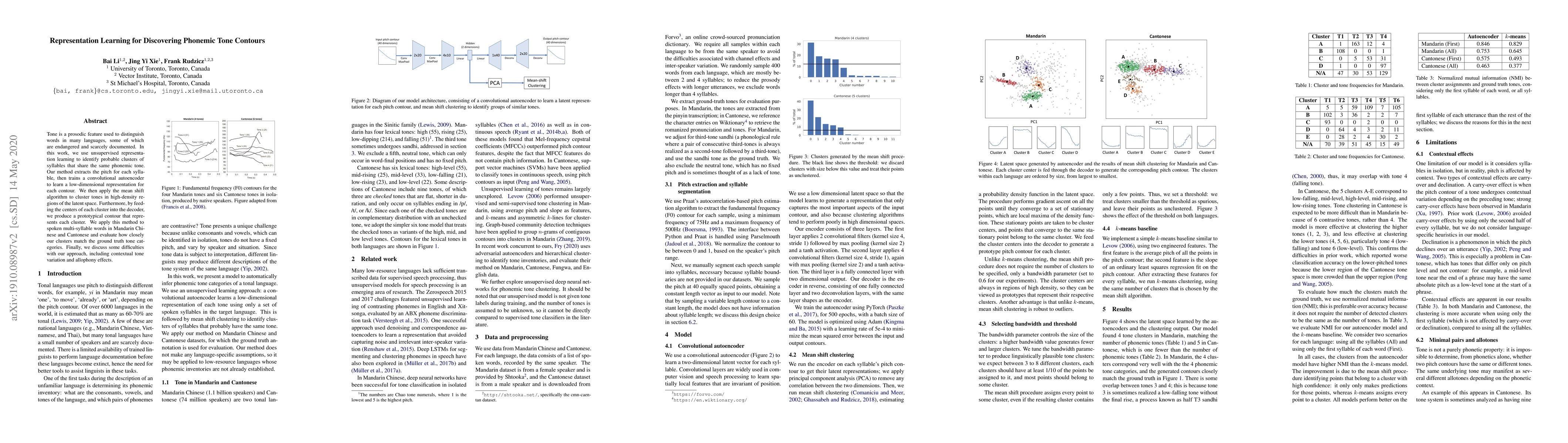 This paper employs unsupervised representation learning to identify phonemic tone contours in spoken Mandarin Chinese and Cantonese. It uses a convolutional autoencoder to extract pitch and cluster tones via mean shift, producing prototypical contours for each cluster, and evaluates the method's accuracy against ground truth tone categories.