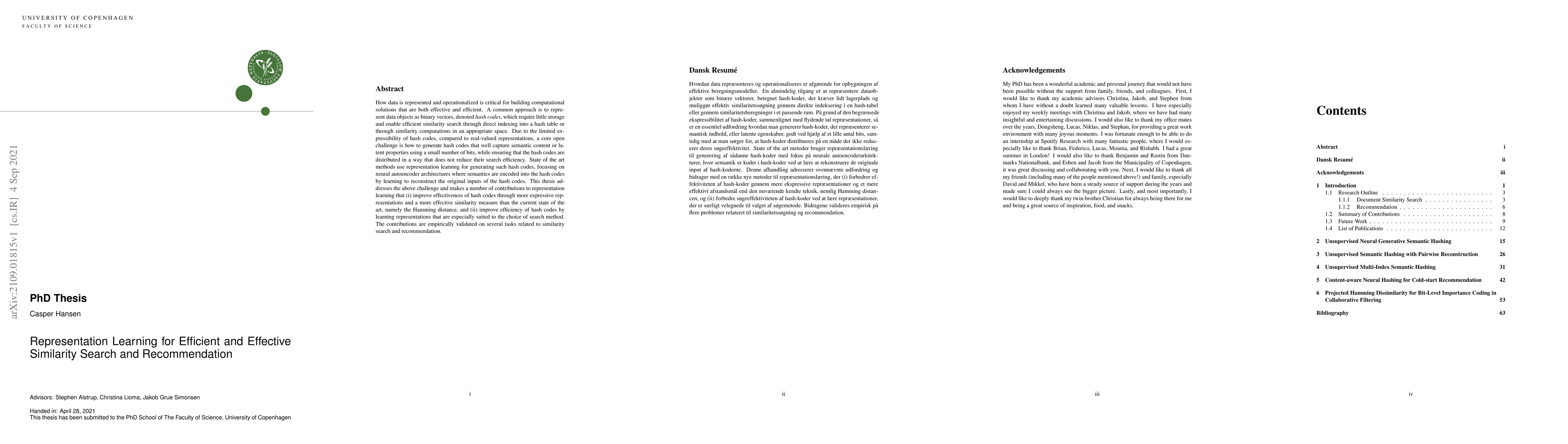 How data is represented and operationalized is critical for building computational solutions that are both effective and efficient. A common approach is to represent data objects as binary vectors, denoted \textit{hash codes}, which require little storage and enable efficient similarity search through direct indexing into a hash table or through similarity computations in an appropriate space. Due to the limited expressibility of hash codes, compared to real-valued representations, a core open challenge is how to generate hash codes that well capture semantic content or latent properties using a small number of bits, while ensuring that the hash codes are distributed in a way that does not reduce their search efficiency. State of the art methods use representation learning for generating such hash codes, focusing on neural autoencoder architectures where semantics are encoded into the hash codes by learning to reconstruct the original inputs of the hash codes. This thesis addresses the above challenge and makes a number of contributions to representation learning that (i) improve effectiveness of hash codes through more expressive representations and a more effective similarity measure than the current state of the art, namely the Hamming distance, and (ii) improve efficiency of hash codes by learning representations that are especially suited to the choice of search method. The contributions are empirically validated on several tasks related to similarity search and recommendation.