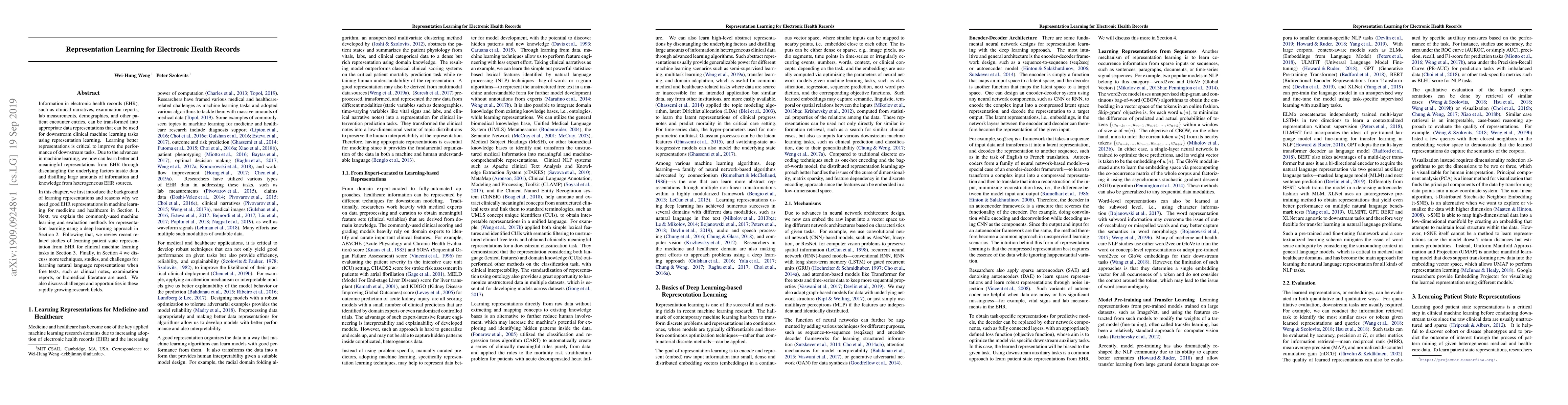 The paper discusses representation learning for electronic health records (EHR) using machine learning techniques, focusing on deep learning approaches. It covers modular neural network architectures, temporal and hierarchical modeling, domain knowledge injection, and interpretability.