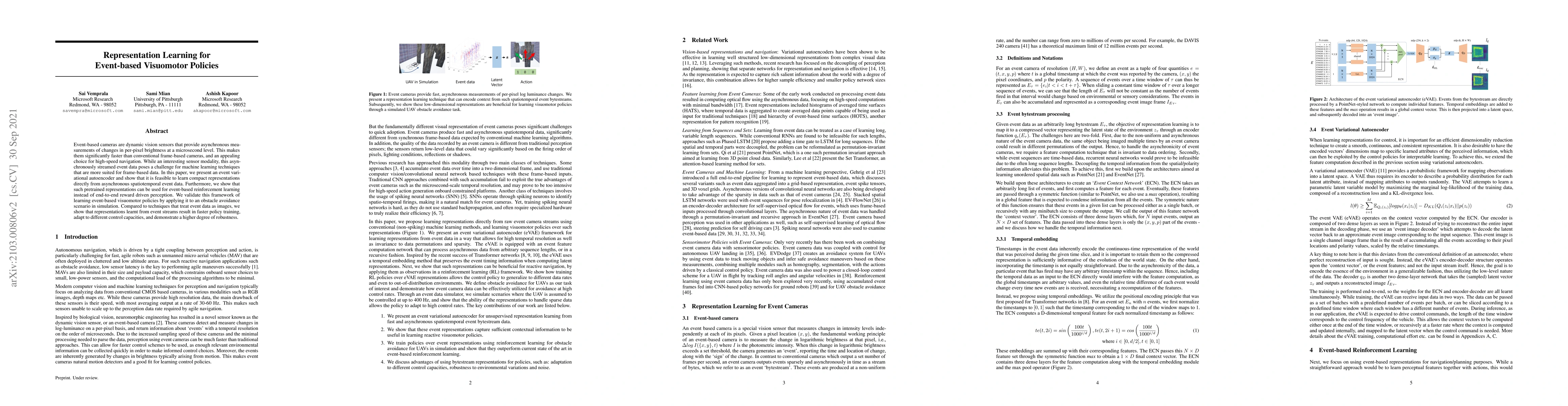 Event-based cameras are dynamic vision sensors that provide asynchronous measurements of changes in per-pixel brightness at a microsecond level. This makes them significantly faster than conventional frame-based cameras, and an appealing choice for high-speed navigation. While an interesting sensor modality, this asynchronously streamed event data poses a challenge for machine learning techniques that are more suited for frame-based data. In this paper, we present an event variational autoencoder and show that it is feasible to learn compact representations directly from asynchronous spatiotemporal event data. Furthermore, we show that such pretrained representations can be used for event-based reinforcement learning instead of end-to-end reward driven perception. We validate this framework of learning event-based visuomotor policies by applying it to an obstacle avoidance scenario in simulation. Compared to techniques that treat event data as images, we show that representations learnt from event streams result in faster policy training, adapt to different control capacities, and demonstrate a higher degree of robustness.