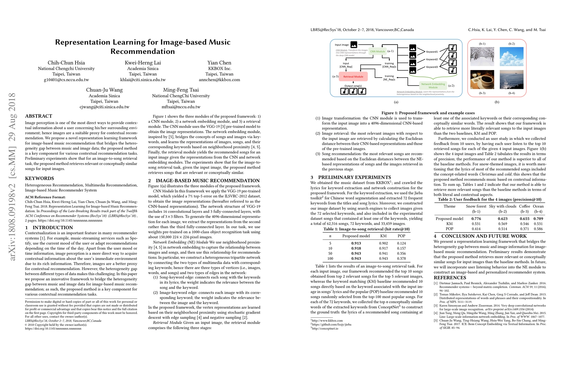 This paper proposes a novel representation learning framework to bridge the heterogeneity gap between music and image data for contextual music recommendation. Preliminary experiments demonstrate that the method effectively retrieves relevant or conceptually similar songs for given images.