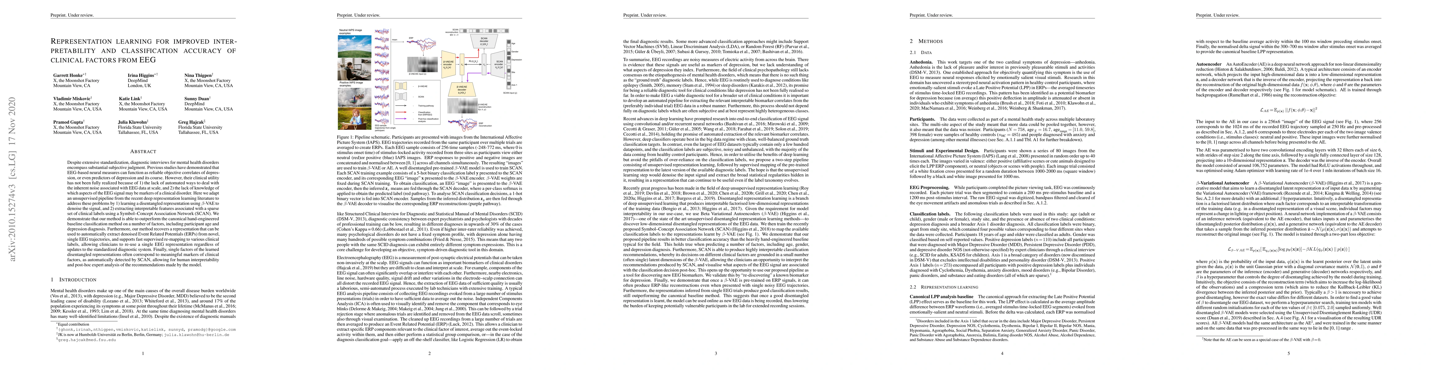 Despite extensive standardization, diagnostic interviews for mental health disorders encompass substantial subjective judgment. Previous studies have demonstrated that EEG-based neural measures can function as reliable objective correlates of depression, or even predictors of depression and its course. However, their clinical utility has not been fully realized because of 1) the lack of automated ways to deal with the inherent noise associated with EEG data at scale, and 2) the lack of knowledge of which aspects of the EEG signal may be markers of a clinical disorder. Here we adapt an unsupervised pipeline from the recent deep representation learning literature to address these problems by 1) learning a disentangled representation using $\beta$-VAE to denoise the signal, and 2) extracting interpretable features associated with a sparse set of clinical labels using a Symbol-Concept Association Network (SCAN). We demonstrate that our method is able to outperform the canonical hand-engineered baseline classification method on a number of factors, including participant age and depression diagnosis. Furthermore, our method recovers a representation that can be used to automatically extract denoised Event Related Potentials (ERPs) from novel, single EEG trajectories, and supports fast supervised re-mapping to various clinical labels, allowing clinicians to re-use a single EEG representation regardless of updates to the standardized diagnostic system. Finally, single factors of the learned disentangled representations often correspond to meaningful markers of clinical factors, as automatically detected by SCAN, allowing for human interpretability and post-hoc expert analysis of the recommendations made by the model.