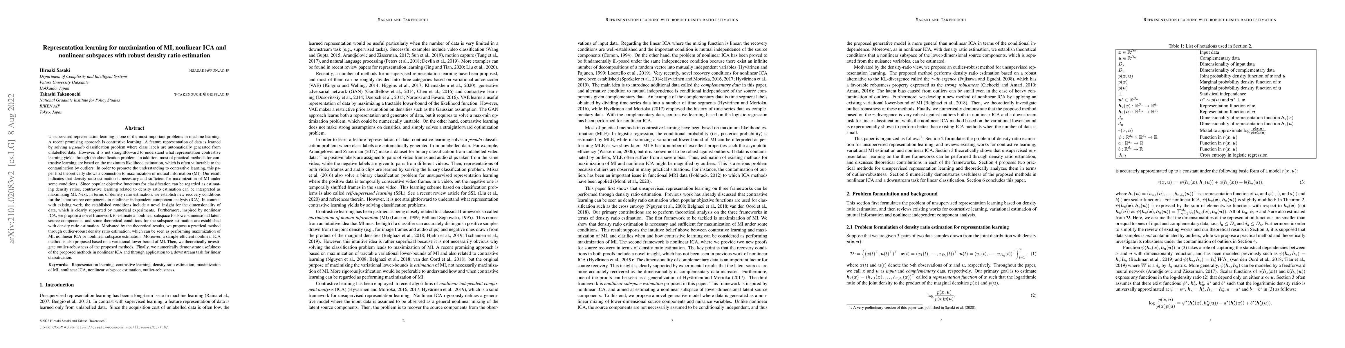 Contrastive learning is a recent promising approach in unsupervised representation learning where a feature representation of data is learned by solving a pseudo classification problem from unlabelled data. However, it is not straightforward to understand what representation contrastive learning yields. In addition, contrastive learning is often based on the maximum likelihood estimation, which tends to be vulnerable to the contamination by outliers. To promote the understanding to contrastive learning, this paper first theoretically shows a connection to maximization of mutual information (MI). Our result indicates that density ratio estimation is necessary and sufficient for maximization of MI under some conditions. Thus, contrastive learning related to density ratio estimation as done in popular objective functions can be interpreted as maximizing MI. Next, with the density ratio, we establish new recovery conditions for the latent source components in nonlinear independent component analysis (ICA). In contrast with existing work, the established conditions include a novel insight for the dimensionality of data, which is clearly supported by numerical experiments. Furthermore, inspired by nonlinear ICA, we propose a novel framework to estimate a nonlinear subspace for lower-dimensional latent source components, and some theoretical conditions for the subspace estimation are established with the density ratio. Then, we propose a practical method through outlier-robust density ratio estimation, which can be seen as performing maximization of MI, nonlinear ICA or nonlinear subspace estimation. Moreover, a sample-efficient nonlinear ICA method is also proposed. We theoretically investigate outlier-robustness of the proposed methods. Finally, the usefulness of the proposed methods is numerically demonstrated in nonlinear ICA and through application to linear classification.