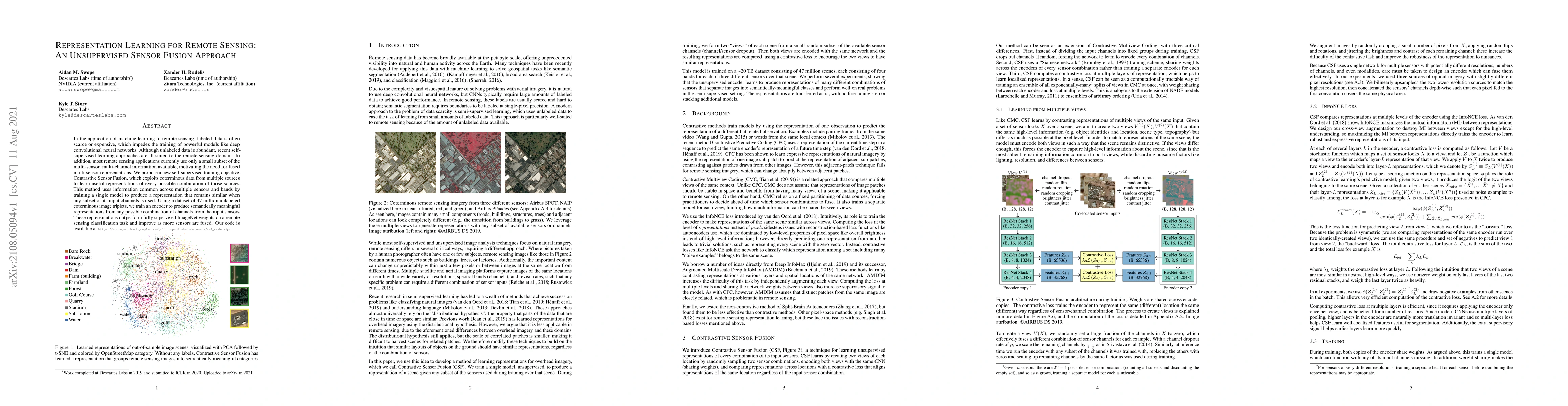 This paper introduces a self-supervised learning method called Contrastive Sensor Fusion to address the scarcity of labeled data in remote sensing. The proposed approach effectively fuses multi-sensor data to learn meaningful representations, outperforming supervised ImageNet weights on classification tasks.