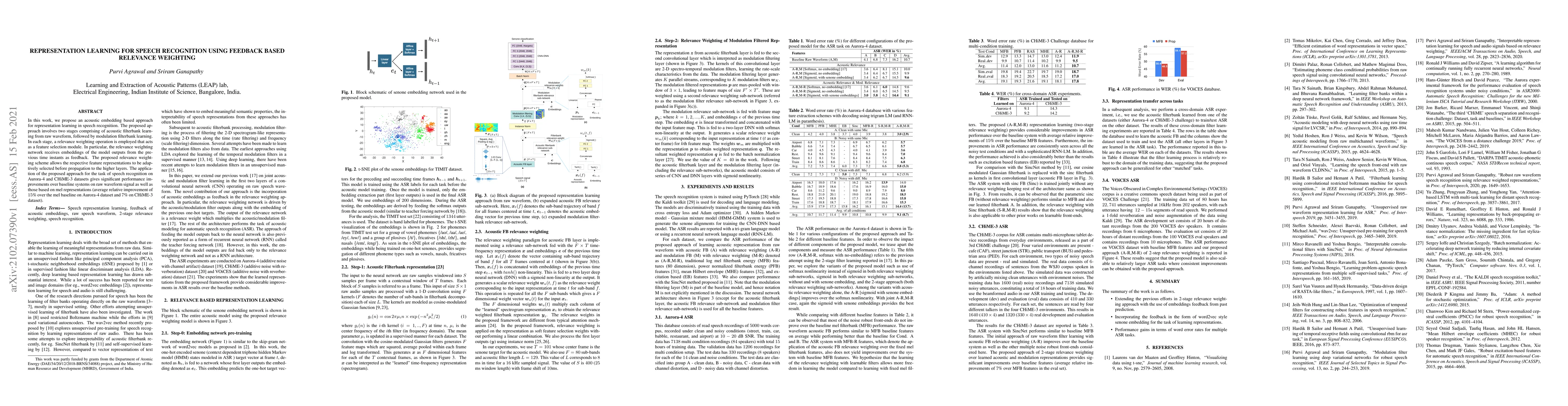 This paper proposes an acoustic embedding approach for speech recognition that uses feedback-based relevance weighting for feature selection. The method shows significant performance improvements, achieving a 15% relative improvement over mel baseline on Aurora-4 and a 7% improvement on CHiME-3 datasets.