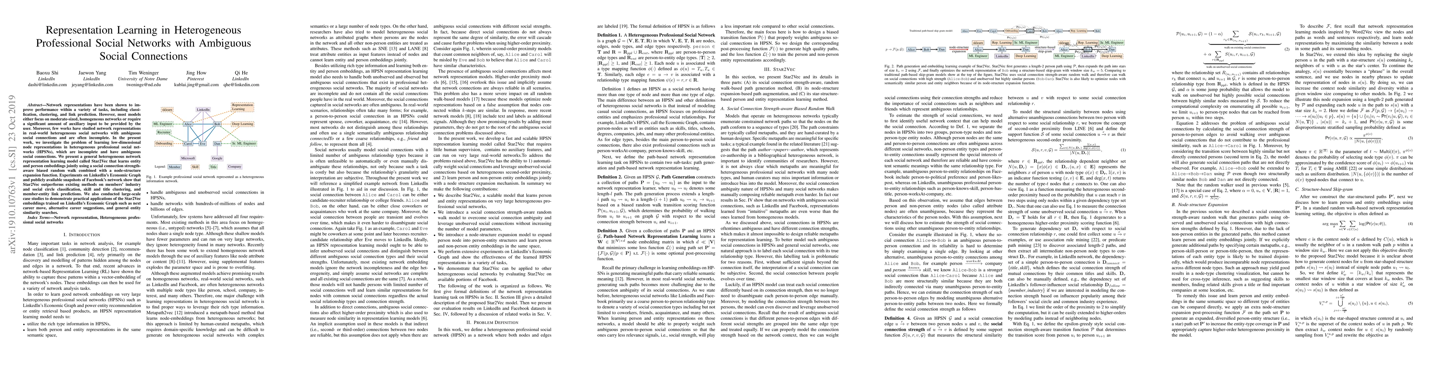 This paper proposes Star2Vec, a model for learning low-dimensional representations in heterogeneous professional social networks with ambiguous connections. It outperforms existing methods in various tasks, demonstrating practical applications like career suggestions and entity similarity searches.