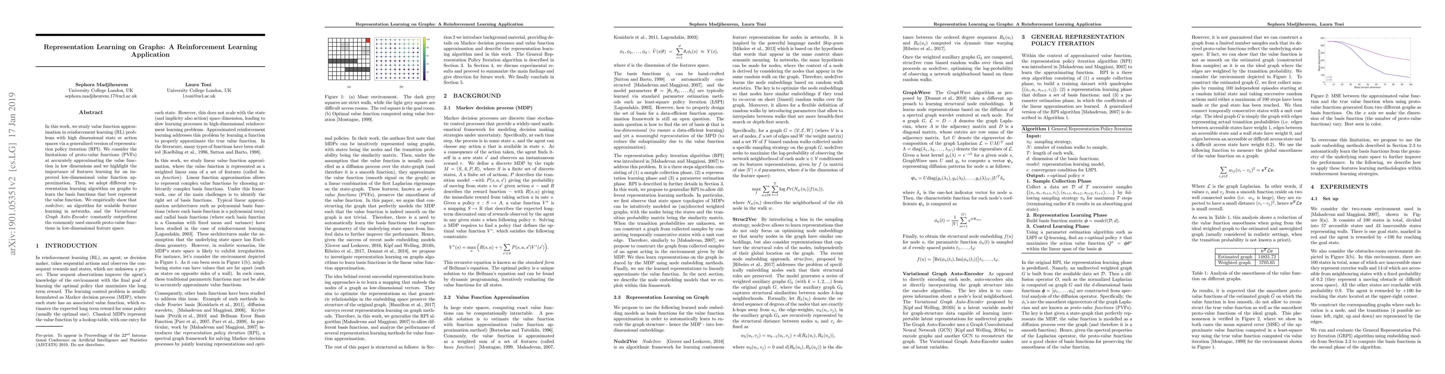This research paper explores using reinforcement learning to approximate value functions on graphs with high-dimensional state and action spaces. It shows that node2vec and Variational Graph Auto-Encoder outperform proto-value functions in low-dimensional feature space.