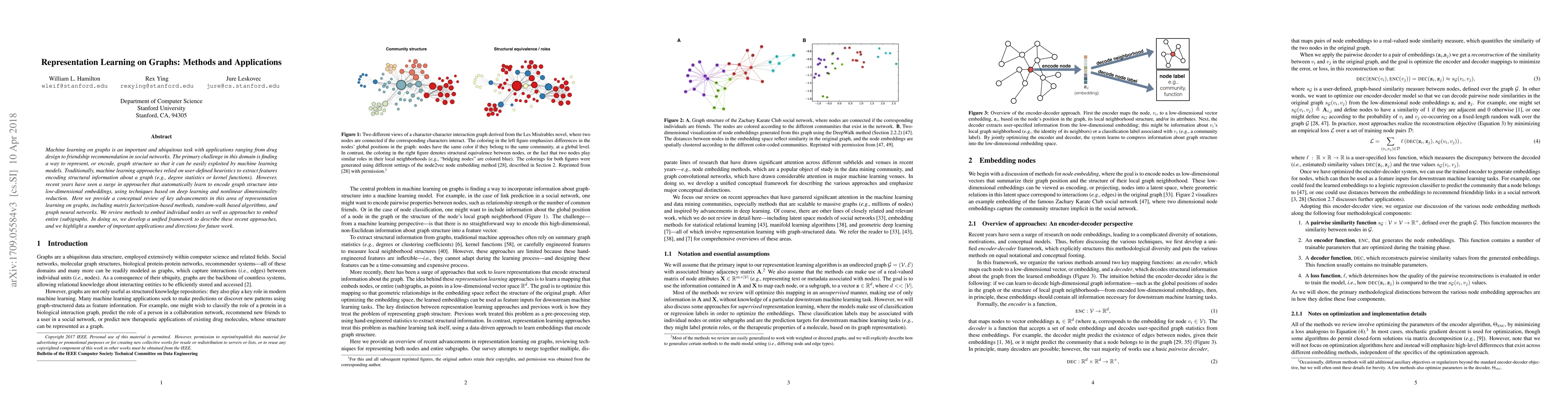 Machine learning on graphs is an important and ubiquitous task with applications ranging from drug design to friendship recommendation in social networks. The primary challenge in this domain is finding a way to represent, or encode, graph structure so that it can be easily exploited by machine learning models. Traditionally, machine learning approaches relied on user-defined heuristics to extract features encoding structural information about a graph (e.g., degree statistics or kernel functions). However, recent years have seen a surge in approaches that automatically learn to encode graph structure into low-dimensional embeddings, using techniques based on deep learning and nonlinear dimensionality reduction. Here we provide a conceptual review of key advancements in this area of representation learning on graphs, including matrix factorization-based methods, random-walk based algorithms, and graph neural networks. We review methods to embed individual nodes as well as approaches to embed entire (sub)graphs. In doing so, we develop a unified framework to describe these recent approaches, and we highlight a number of important applications and directions for future work.