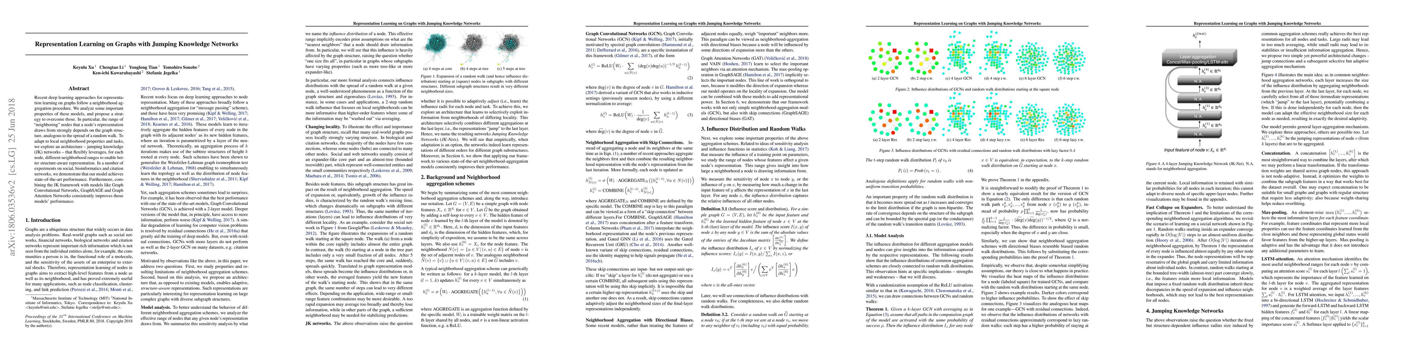 Recent deep learning approaches for representation learning on graphs follow a neighborhood aggregation procedure. We analyze some important properties of these models, and propose a strategy to overcome those. In particular, the range of "neighboring" nodes that a node's representation draws from strongly depends on the graph structure, analogous to the spread of a random walk. To adapt to local neighborhood properties and tasks, we explore an architecture -- jumping knowledge (JK) networks -- that flexibly leverages, for each node, different neighborhood ranges to enable better structure-aware representation. In a number of experiments on social, bioinformatics and citation networks, we demonstrate that our model achieves state-of-the-art performance. Furthermore, combining the JK framework with models like Graph Convolutional Networks, GraphSAGE and Graph Attention Networks consistently improves those models' performance.