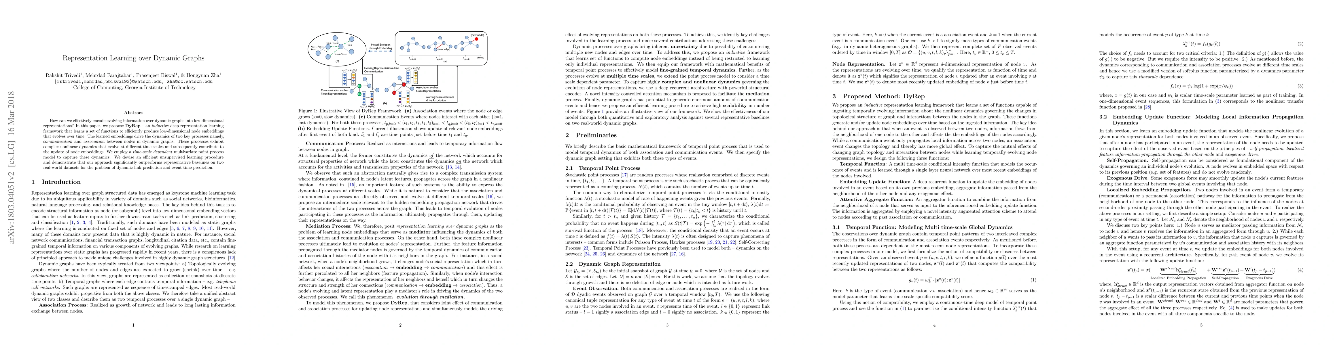 How can we effectively encode evolving information over dynamic graphs into low-dimensional representations? In this paper, we propose DyRep, an inductive deep representation learning framework that learns a set of functions to efficiently produce low-dimensional node embeddings that evolves over time. The learned embeddings drive the dynamics of two key processes namely, communication and association between nodes in dynamic graphs. These processes exhibit complex nonlinear dynamics that evolve at different time scales and subsequently contribute to the update of node embeddings. We employ a time-scale dependent multivariate point process model to capture these dynamics. We devise an efficient unsupervised learning procedure and demonstrate that our approach significantly outperforms representative baselines on two real-world datasets for the problem of dynamic link prediction and event time prediction.