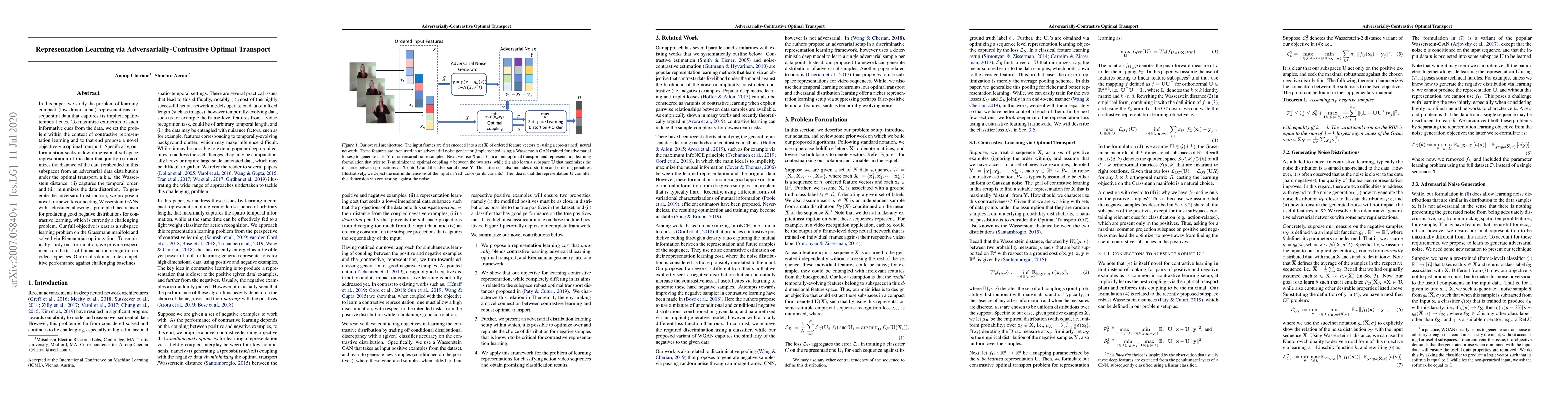 This paper proposes a novel adversarially-contrastive optimal transport method for learning low-dimensional representations of sequential data, aiming to maximize spatio-temporal cue extraction. The approach integrates Wasserstein GANs with a classifier to generate adversarial distributions, and it is solved via Riemannian optimization on the Grassmann manifold, achieving competitive performance in human action recognition.