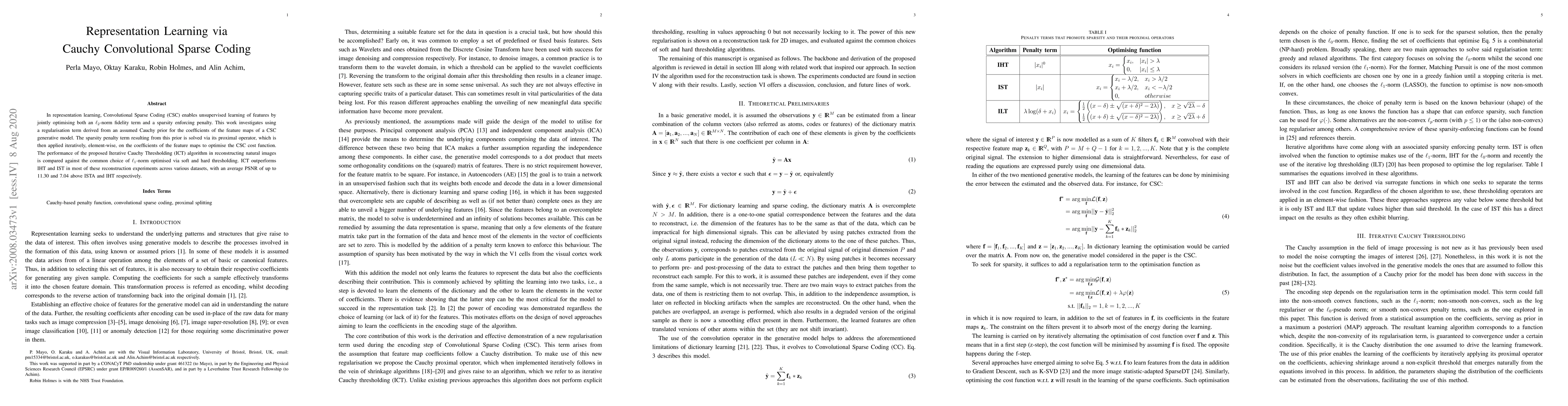 This paper proposes an Iterative Cauchy Thresholding (ICT) algorithm for representation learning using Convolutional Sparse Coding (CSC) with a Cauchy prior for feature maps. ICT outperforms \(\ell_1\)-norm methods like ISTA and IHT in reconstructing natural images, achieving higher PSNR values.