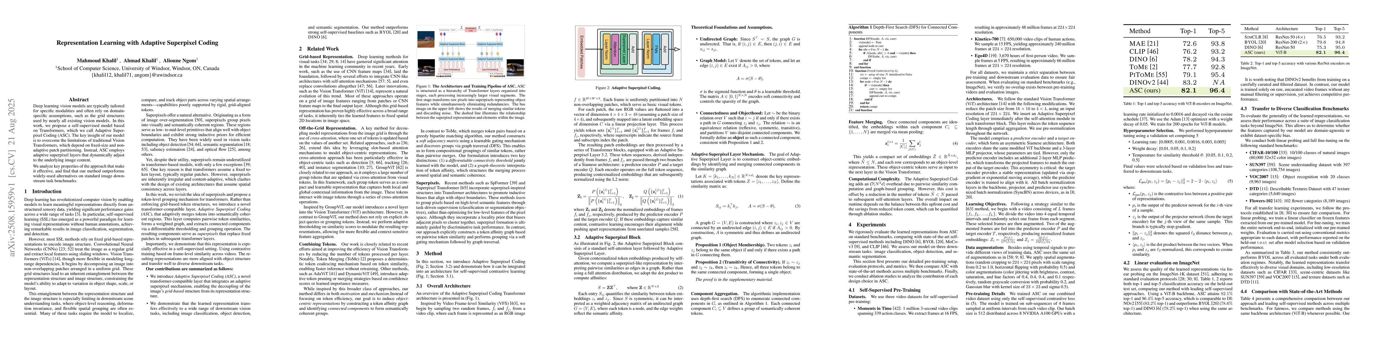 Deep learning vision models are typically tailored for specific modalities and often rely on domain-specific assumptions, such as the grid structures used by nearly all existing vision models. In this work, we propose a self-supervised model based on Transformers, which we call Adaptive Superpixel Coding (ASC). The key insight of our model is to overcome the limitations of traditional Vision Transformers, which depend on fixed-size and non-adaptive patch partitioning. Instead, ASC employs adaptive superpixel layers that dynamically adjust to the underlying image content. We analyze key properties of the approach that make it effective, and find that our method outperforms widely-used alternatives on standard image downstream task benchmarks.
