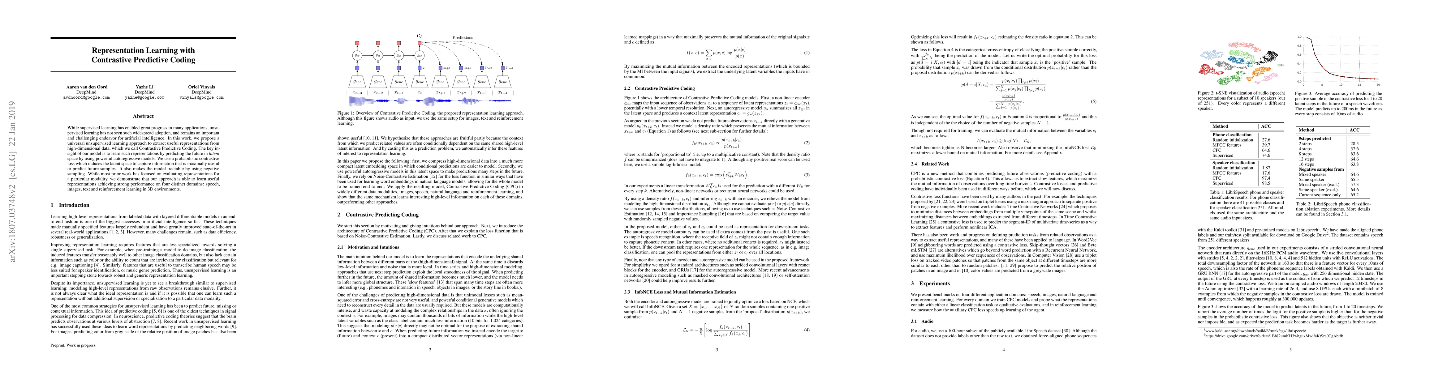 This paper introduces Contrastive Predictive Coding (CPC), an unsupervised learning method that extracts useful representations from high-dimensional data by predicting future samples in latent space. The model employs a probabilistic contrastive loss and uses negative sampling to make it tractable, demonstrating strong performance across speech, images, text, and reinforcement learning domains.