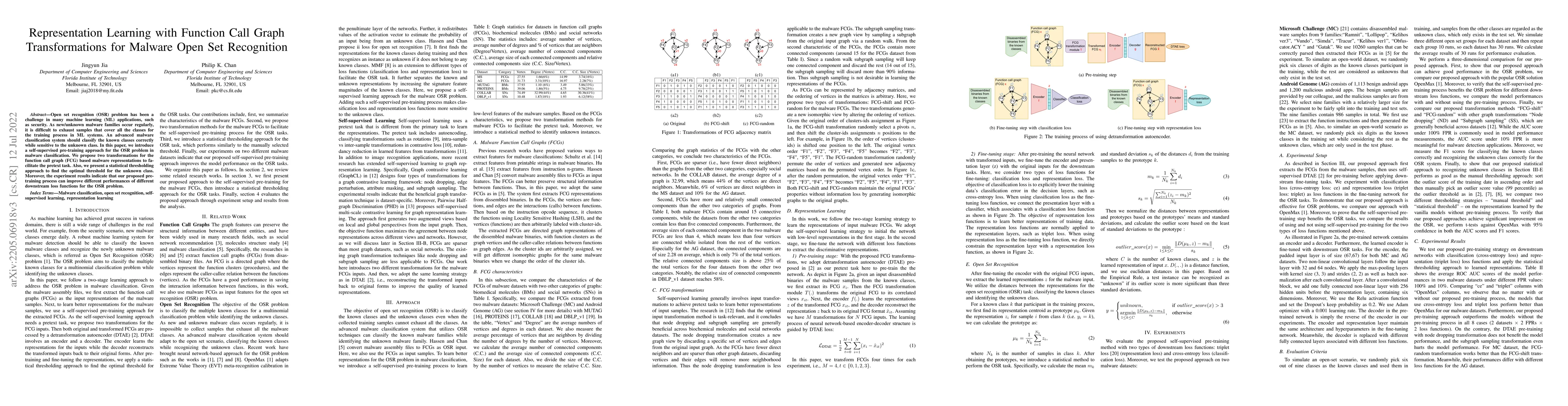 This paper proposes a self-supervised pre-training method for open set recognition in malware classification using function call graph transformations. It introduces two FCG-based transformations and a statistical thresholding approach to handle unknown malware classes, demonstrating improved performance across various downstream loss functions.