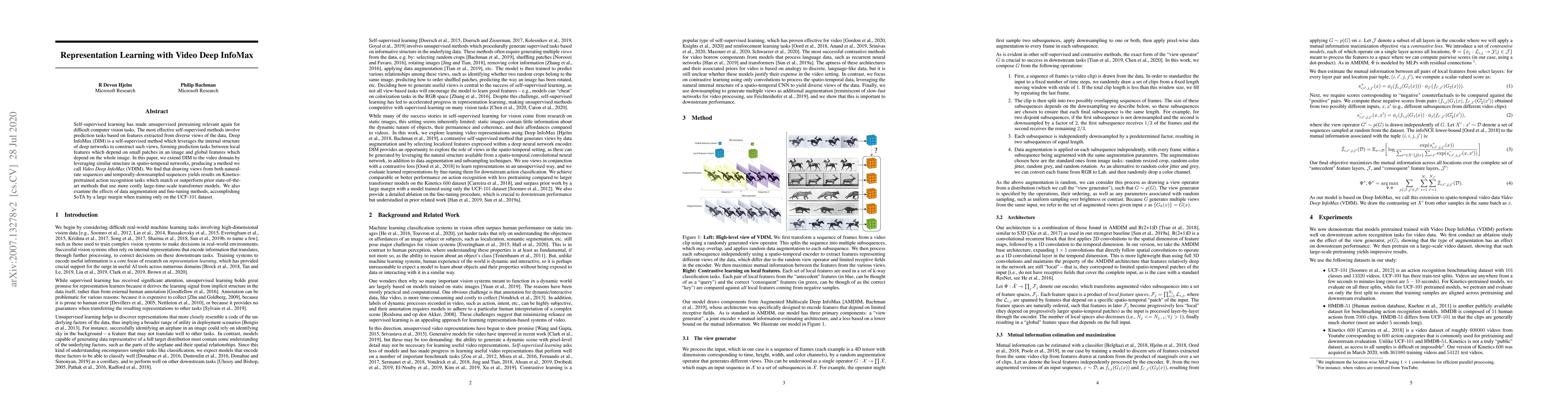 This paper introduces Video Deep InfoMax (VDIM), a self-supervised learning method for video representation, extending DeepInfoMax to leverage temporal information. The method matches or outperforms state-of-the-art action recognition results using spatio-temporal networks, especially when fine-tuned on the UCF-101 dataset.