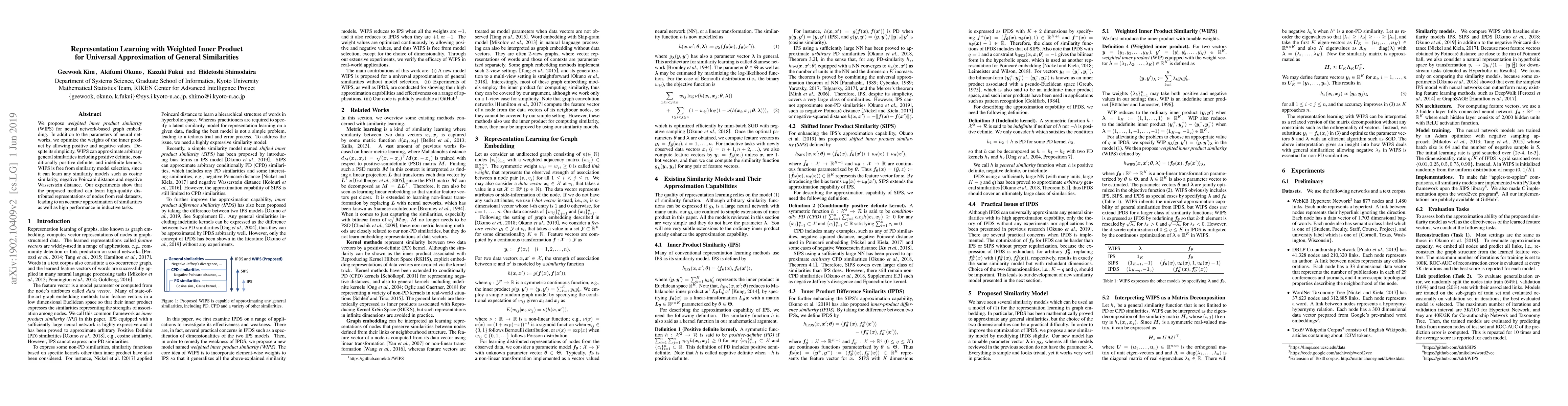 We propose $\textit{weighted inner product similarity}$ (WIPS) for neural network-based graph embedding. In addition to the parameters of neural networks, we optimize the weights of the inner product by allowing positive and negative values. Despite its simplicity, WIPS can approximate arbitrary general similarities including positive definite, conditionally positive definite, and indefinite kernels. WIPS is free from similarity model selection, since it can learn any similarity models such as cosine similarity, negative Poincar\'e distance and negative Wasserstein distance. Our experiments show that the proposed method can learn high-quality distributed representations of nodes from real datasets, leading to an accurate approximation of similarities as well as high performance in inductive tasks.