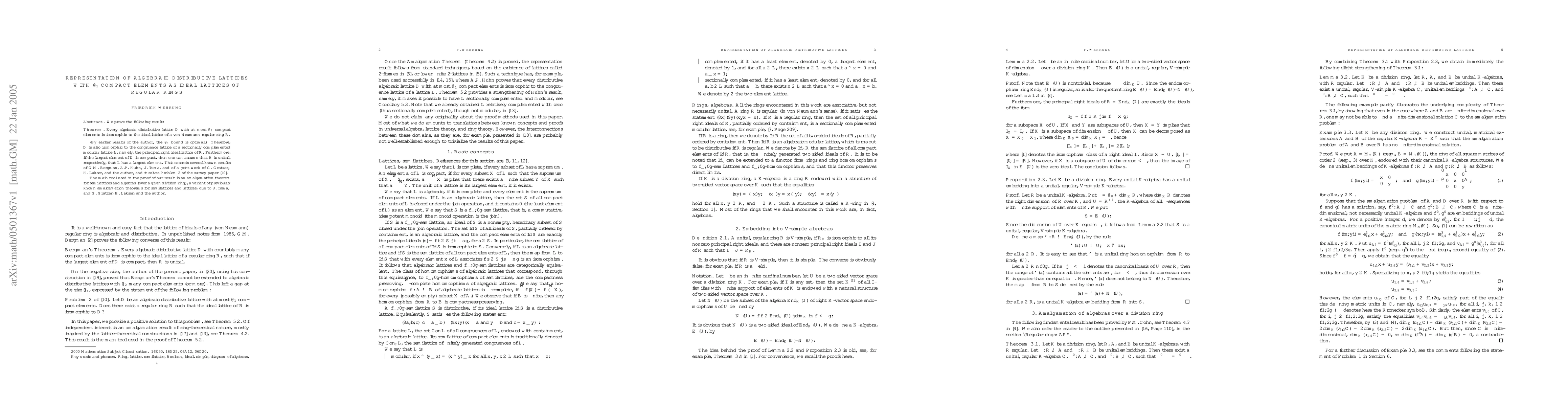 A research paper proves that algebraic distributive lattices with at most α compact elements can be represented as ideal lattices of regular rings or congruence lattices of sectionally complemented modular lattices.