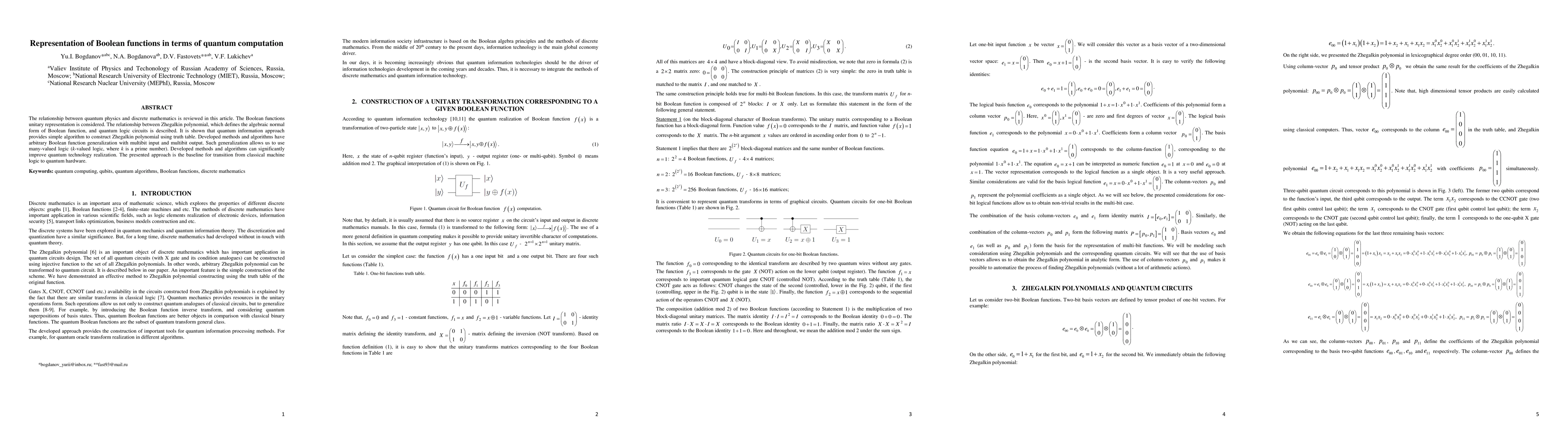 This paper explores the connection between quantum physics and discrete mathematics, focusing on the unitary representation of Boolean functions. It demonstrates how quantum information techniques can simplify the construction of Zhegalkin polynomials, enabling the generalization of Boolean functions for multibit inputs and outputs, and paving the way for advancements in quantum technology.