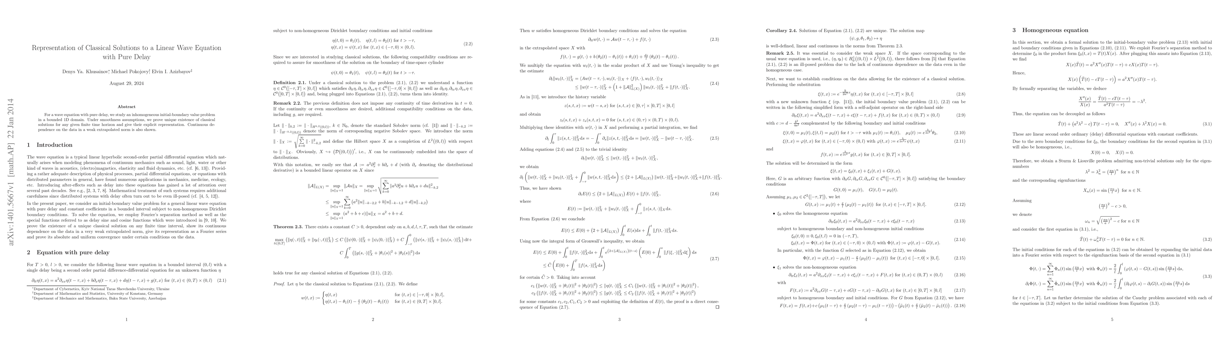 This paper proves the existence of classical solutions to a linear wave equation with pure delay for inhomogeneous initial-boundary value problems, showing their explicit representation and continuous dependence on data.