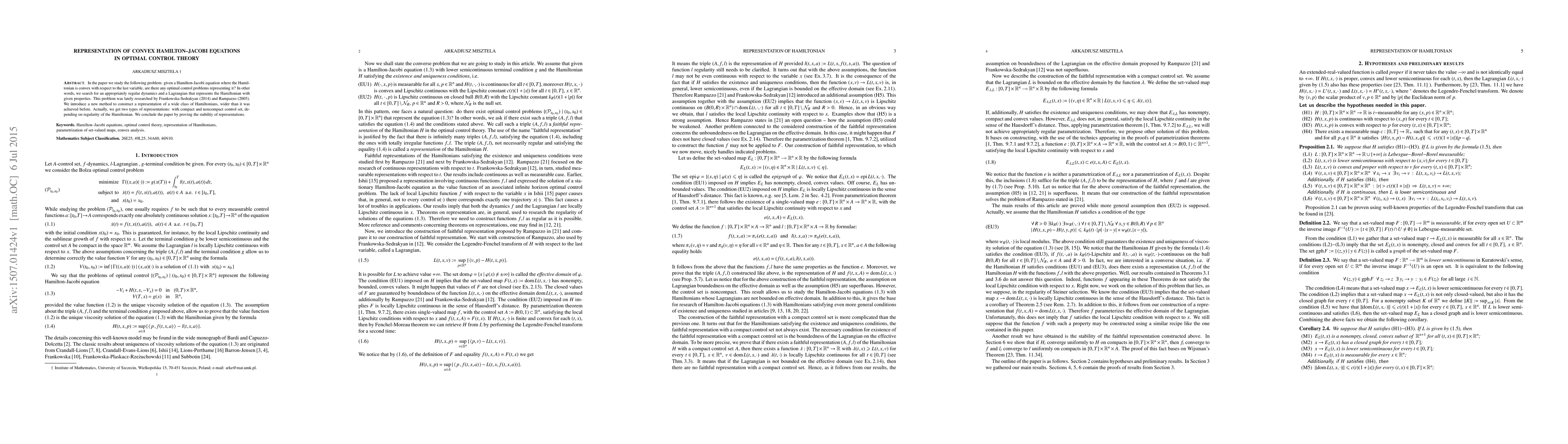 This paper investigates the representation of convex Hamilton-Jacobi equations in optimal control theory, proposing a new method to construct representations for a broader class of Hamiltonians. It provides two types of representations based on the control set's compactness and proves the stability of these representations.