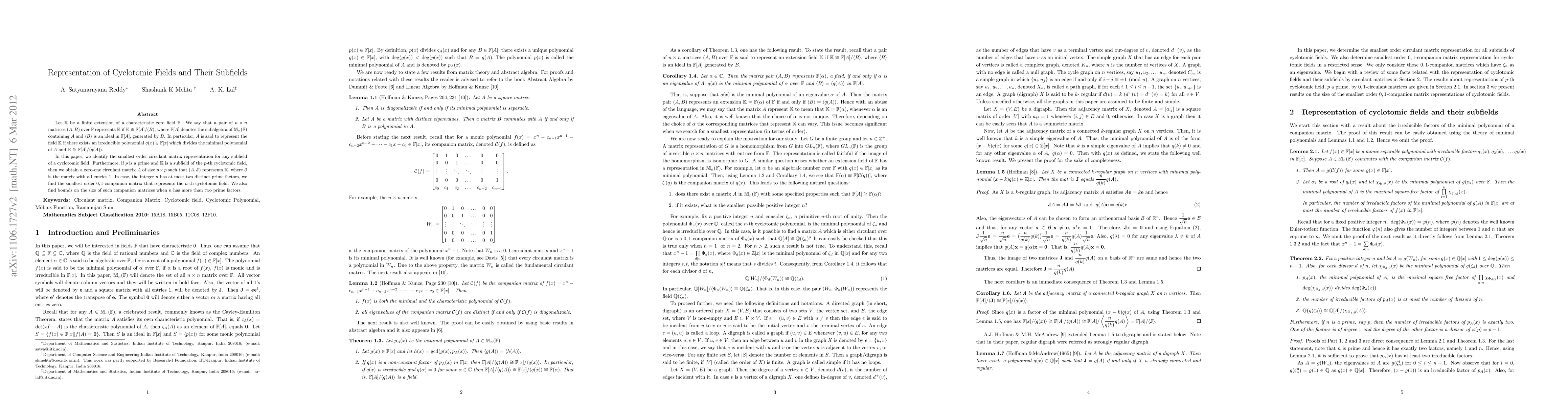 This research paper identifies smallest circulant-matrix representations for subfields of cyclotomic fields, finding companion matrices for n-th cyclotomic fields with specific prime factor constraints.
