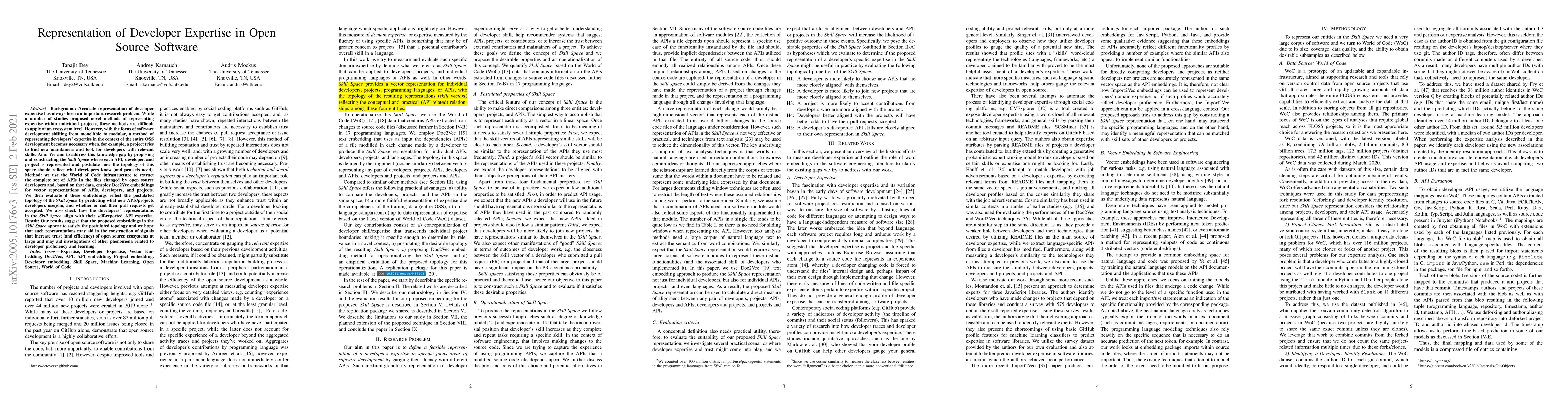 This paper proposes a method to represent developer expertise across open source software ecosystems using a Skill Space model. By employing Doc2Vec embeddings to represent APIs, developers, and projects, the authors evaluate if these representations reflect developer knowledge and project needs, aiming to enhance trust and efficiency in open source collaborations.
