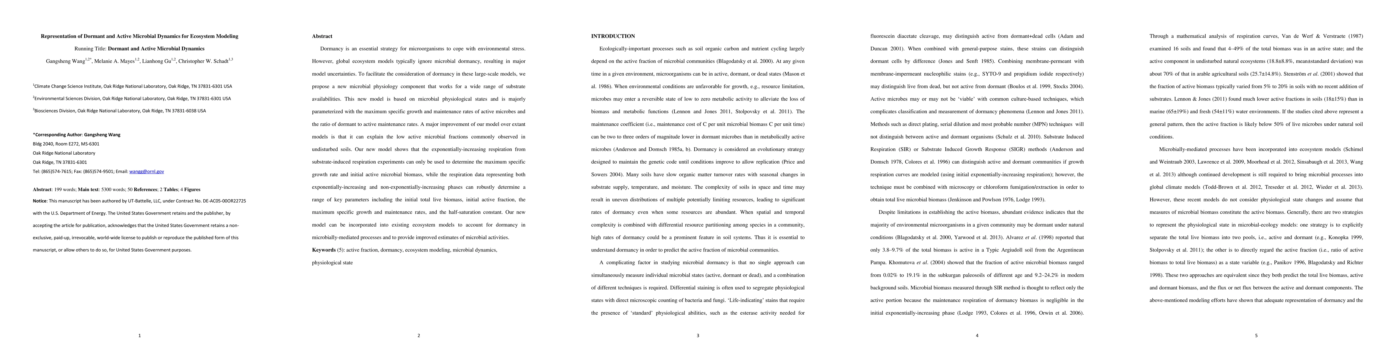 This paper proposes a new microbial physiology component to integrate microbial dormancy into global ecosystem models, addressing uncertainties caused by ignoring dormancy. The model, parameterized by active microbial growth and maintenance rates, can explain low active microbial fractions in undisturbed soils and determine key parameters from respiration data.