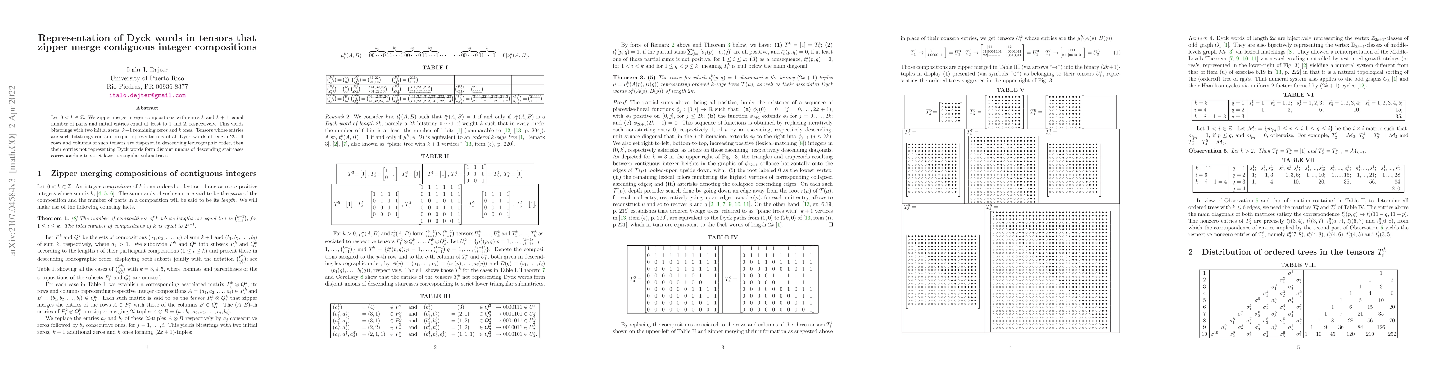 This paper explores the representation of Dyck words in tensors formed by zipper-merging integer compositions. The tensors contain unique representations of all Dyck words of length $2k$, with their entries arranged in descending lexicographic order revealing non-Dyck word entries as disjoint descending staircases.