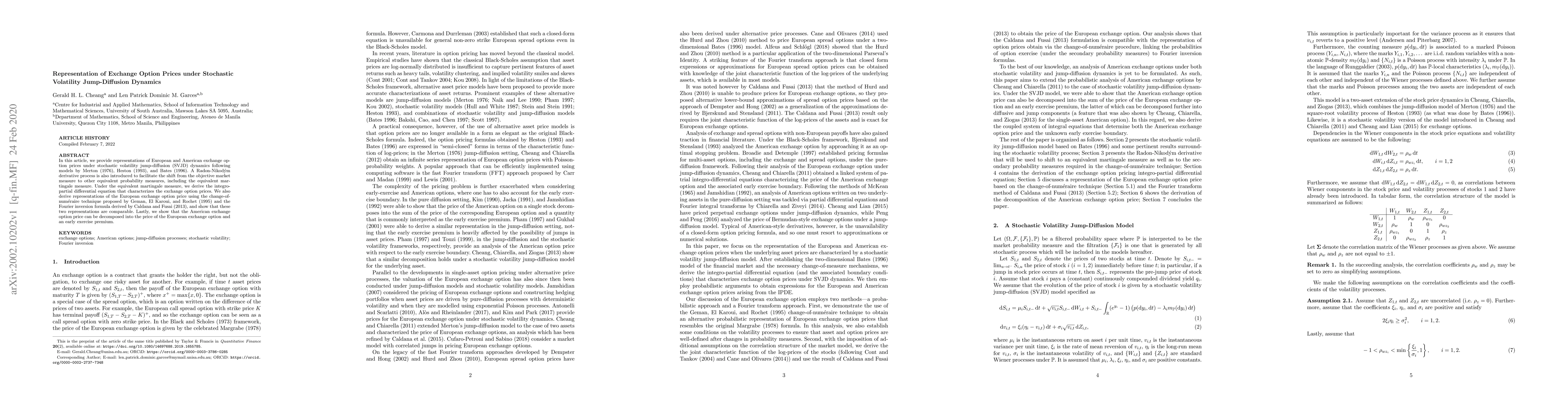 This paper presents representations for European and American exchange option prices under stochastic volatility jump-diffusion dynamics, utilizing models by Merton, Heston, and Bates. It derives an integro-partial differential equation under the equivalent martingale measure and shows the comparability of European exchange option representations via the change-of-numeraire technique and the Fourier inversion formula.