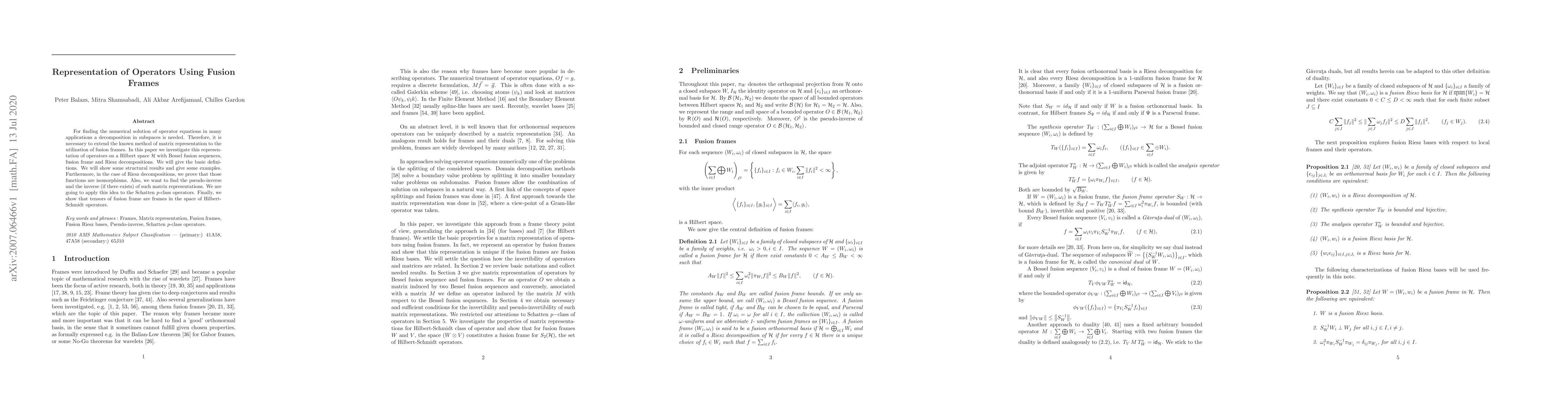 For finding the numerical solution of operator equations in many applications a decomposition in subspaces is needed. Therefore, it is necessary to extend the known method of matrix representation to the utilization of fusion frames. In this paper we investigate this representation of operators on a Hilbert space $\Hil$ with Bessel fusion sequences, fusion frame and Riesz decompositions. We will give the basic definitions. We will show some structural results and give some examples. Furthermore, in the case of Riesz decompositions, we prove that those functions are isomorphisms. Also, we want to find the pseudo-inverse and the inverse (if there exists) of such matrix representations. We are going to apply this idea to the Schatten $p$-class operators. Finally, we show that tensors of fusion frame are frames in the space of Hilbert-Schmidt operators.