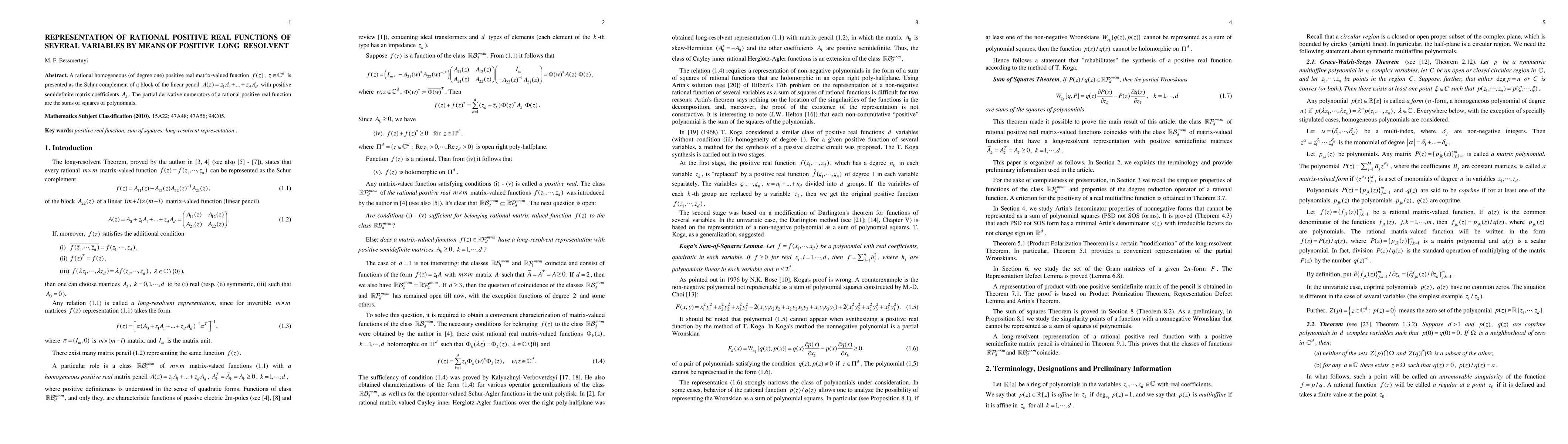 A rational homogeneous (of degree one) positive real matrix-valued function is presented as the Schur complement of a block of the linear pencil with positive semidefinite matrix coefficients. The partial derivative numerators of a rational positive real function are the sums of squares of polynomials.