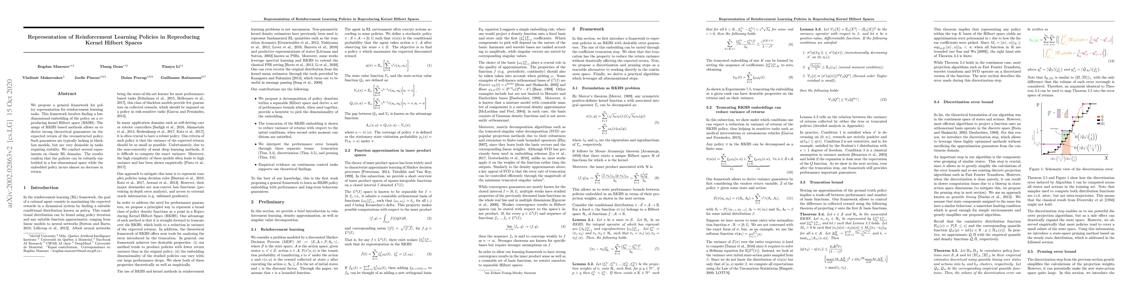 This paper introduces a framework for representing reinforcement learning policies using reproducing kernel Hilbert spaces (RKHS), providing strong theoretical guarantees on policy performance and demonstrating robust policy representation in low-dimensional spaces with minimal return loss through experiments in classic RL domains.