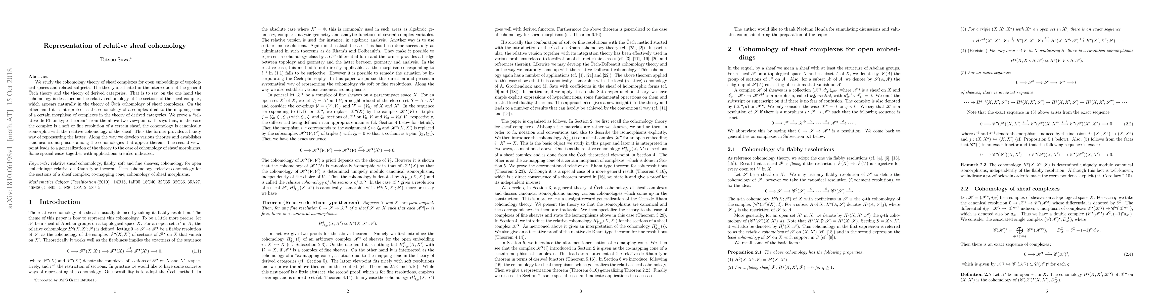 This paper studies the representation of relative sheaf cohomology via two perspectives: Cech theory and derived categories. It proves a "relative de Rham type theorem" showing that under certain conditions, the cohomology of a sheaf complex is isomorphic to its relative cohomology, thus providing a practical representation.