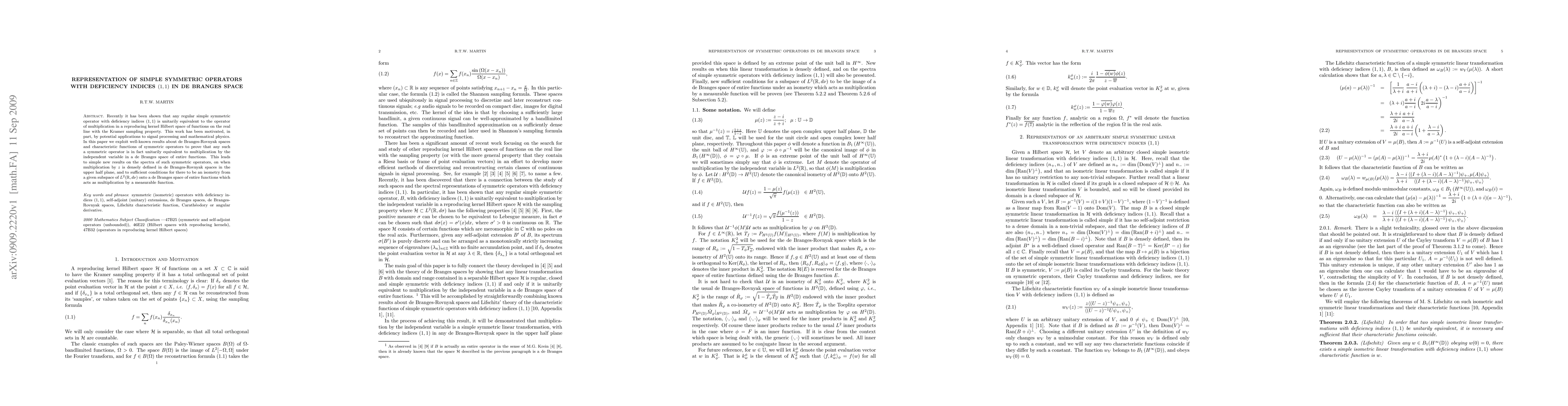Recently it has been shown that any regular simple symmetric operator with deficiency indices (1,1) is unitarily equivalent to the operator of multiplication in a reproducing kernel Hilbert space of functions on the real line with the Kramer sampling property. This work has been motivated, in part, by potential applications to signal processing and mathematical physics. In this paper we exploit well-known results about de Branges-Rovnyak spaces and characteristic functions of symmetric operators to prove that any such a symmetric operator is in fact unitarily equivalent to multiplication by the independent variable in a de Branges space of entire functions. This leads to simple new results on the spectra of such symmetric operators, on when multiplication by z is densely defined in de Branges-Rovnyak spaces in the upper half plane, and to sufficient conditions for there to be an isometry from a given subspace of $L^2 (R, dv) onto a de Branges space of entire functions which acts as multiplication by a measurable function.