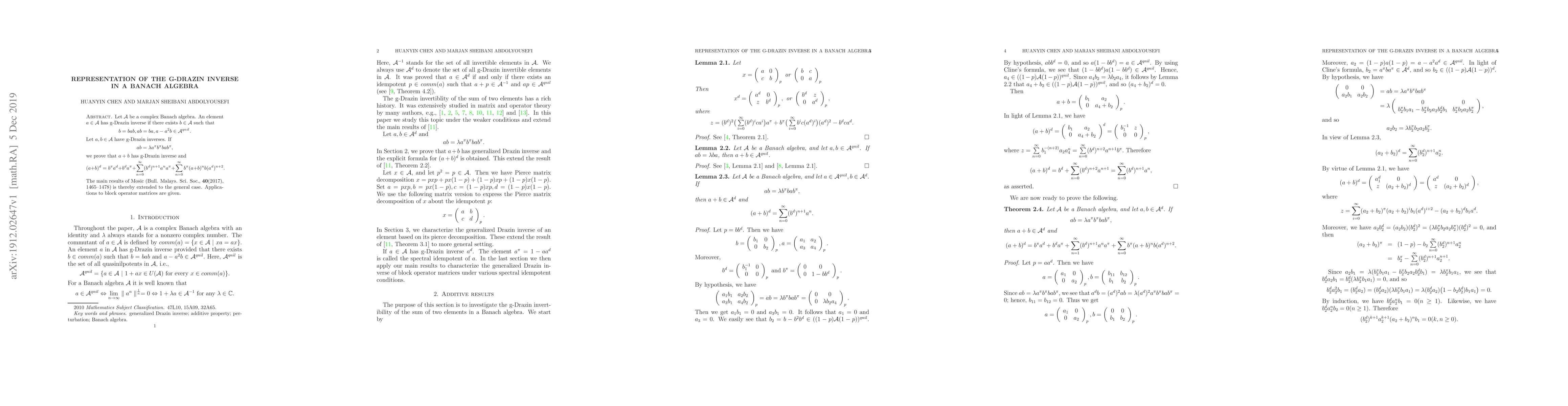 This paper extends the representation of the g-Drazin inverse in a Banach algebra, proving that if two elements have g-Drazin inverses and satisfy a specific product relation, then their sum also has a g-Drazin inverse. The result generalizes previous findings and includes applications to block operator matrices.