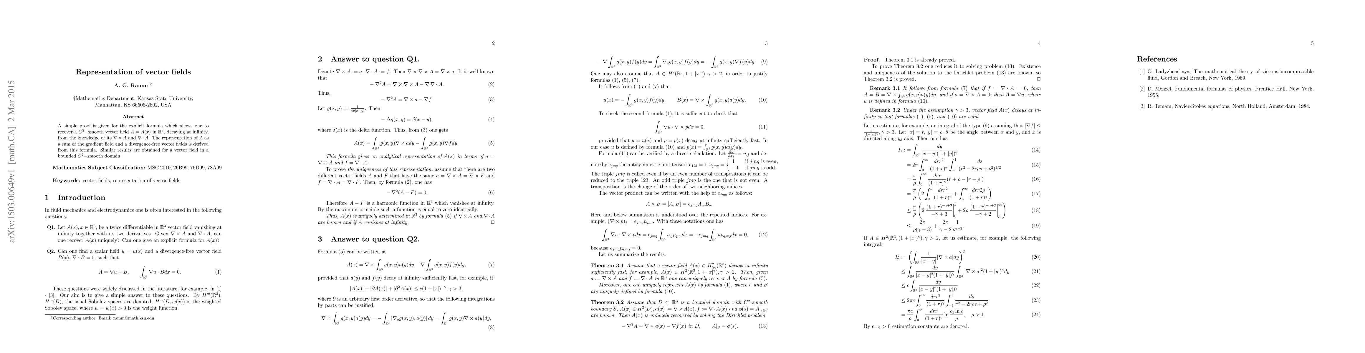 A simple proof is given for the explicit formula which allows one to recover a $C^2-$smooth vector field $A=A(x)$ in $\mathbb{R}^3$, decaying at infinity, from the knowledge of its $\nabla \times A$ and $\nabla \cdot A$. The representation of $A$ as a sum of the gradient field and a divergence-free vector fields is derived from this formula. Similar results are obtained for a vector field in a bounded $C^2-$smooth domain.