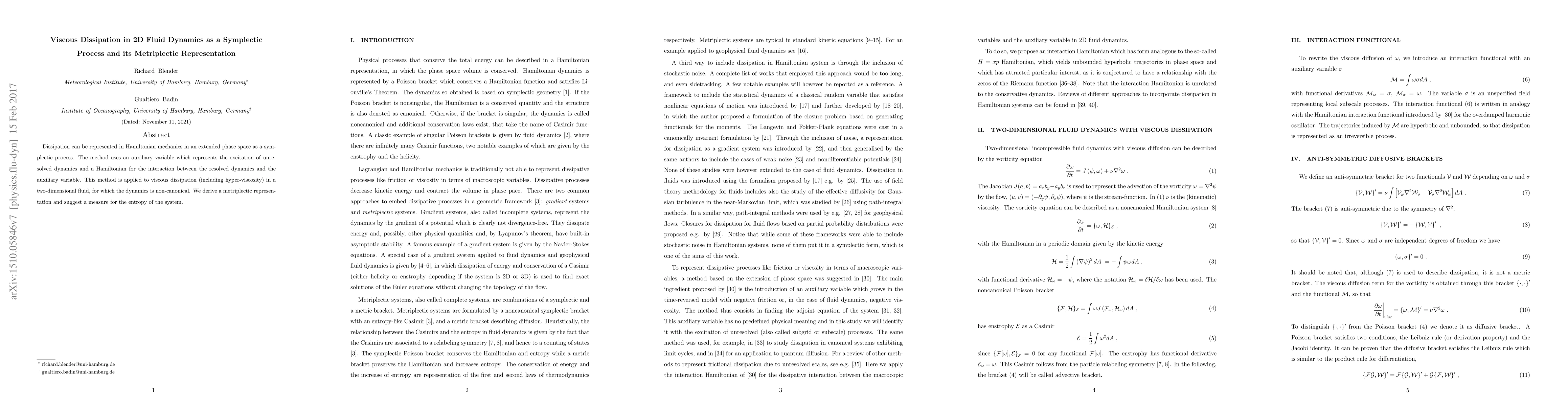 Dissipation can be represented in Hamiltonian mechanics in an extended phase space as a symplectic process. The method uses an auxiliary variable which represents the excitation of unresolved dynamics and a Hamiltonian for the interaction between the resolved dynamics and the auxiliary variable. This method is applied to viscous dissipation (including hyper-viscosity) in a two-dimensional fluid, for which the dynamics is non-canonical. We derive a metriplectic representation and suggest a measure for the entropy of the system.
