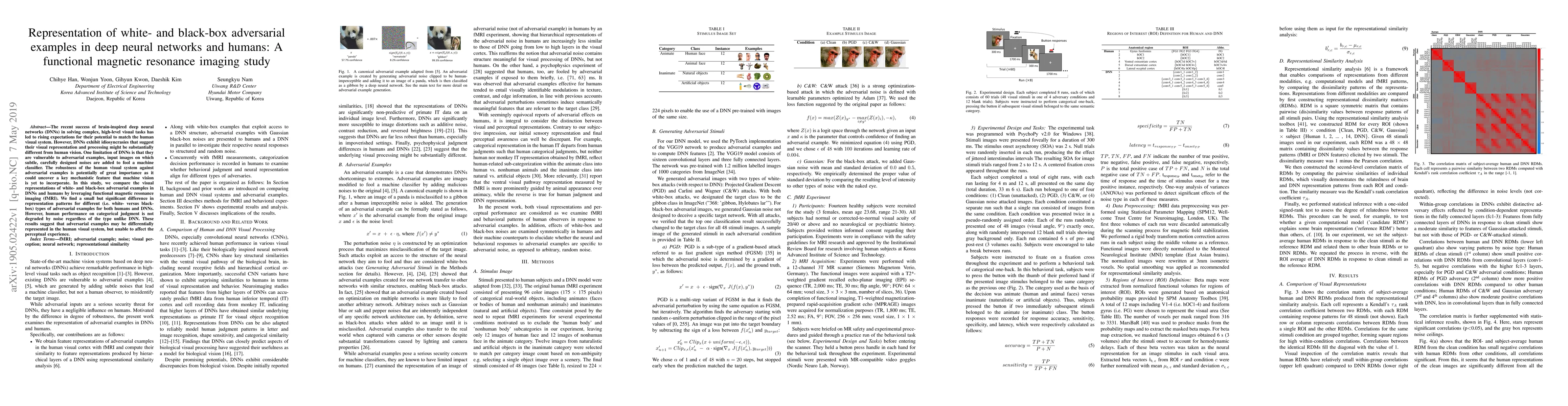 This study uses fMRI to compare how deep neural networks and humans represent white- and black-box adversarial examples, revealing subtle differences in representation patterns. Despite these differences, humans maintain robust performance on categorical judgment, unlike DNNs.
