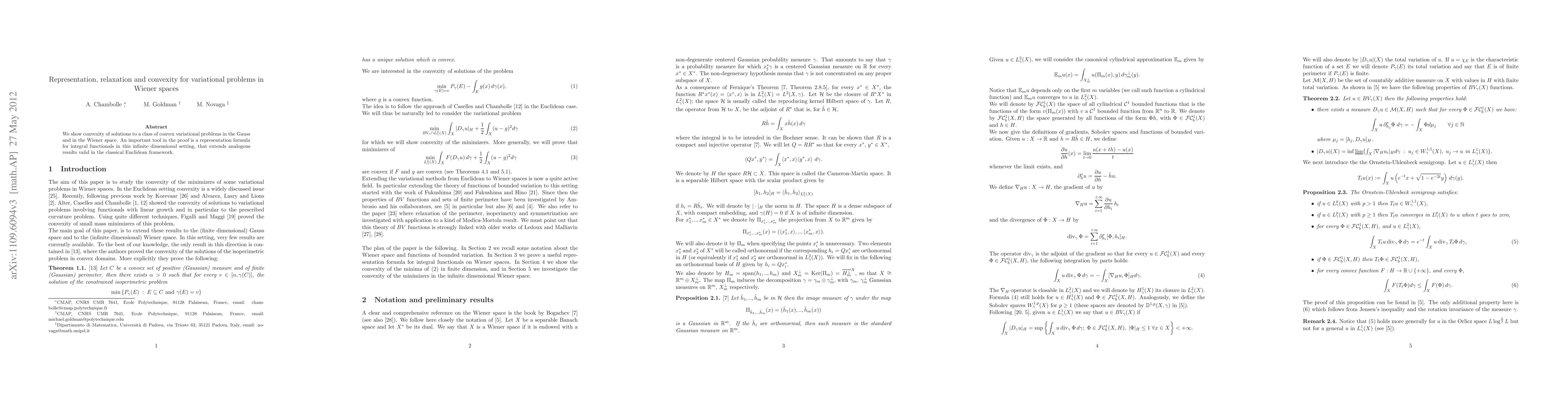 The paper demonstrates the convexity of solutions for a class of convex variational problems in both Gauss and Wiener spaces, using an extended representation formula for integral functionals in infinite dimensions to support the proof.