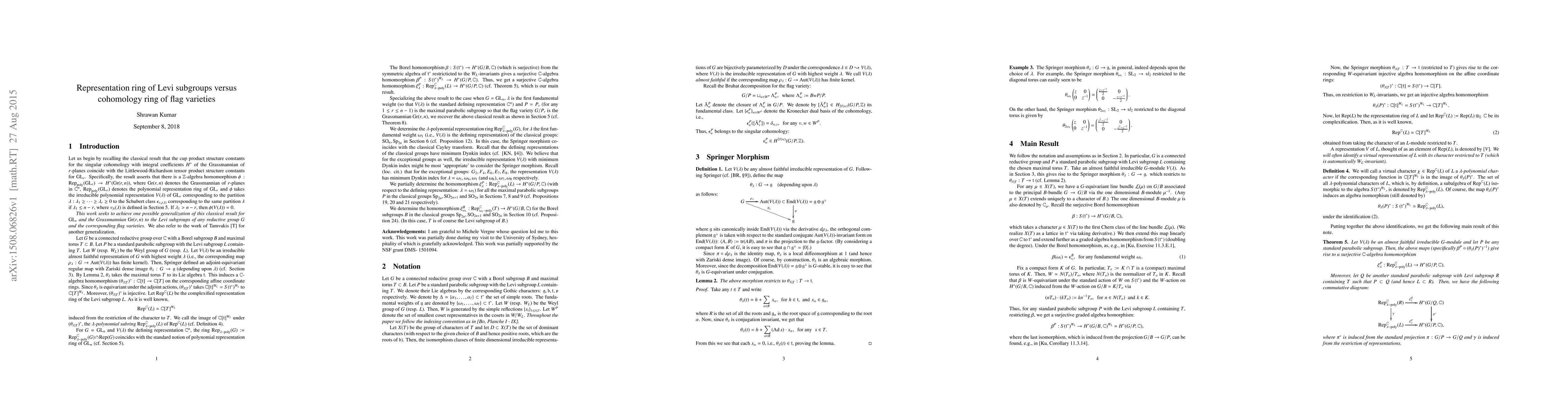 Recall the classical result that the cup product structure constants for the singular cohomology with integral coefficients of the Grassmannian of r-planes coincide with the Littlewood-Richardson tensor product structure constants for GL(r). Specifically, the result asserts that there is an explicit ring homomorphism \phi: \Rep _{\poly}(GL(r)) to H^*(Gr(r, n)), where Gr(r, n) denotes the Grassmannian of r-planes in C^n and \Rep_{\poly} (GL(r)) denotes the polynomial representation ring of GL(r). This work seeks to achieve one possible generalization of this classical result for GL(r) and the Grassmannian Gr(r,n) to the Levi subgroups of any reductive group G and the corresponding flag varieties.